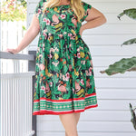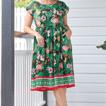 The Holiday Dress is an easy fitting style, to be worn a little bit loose and comfortable. If you are in between sizes, go with the one closest to your bust measurement.
