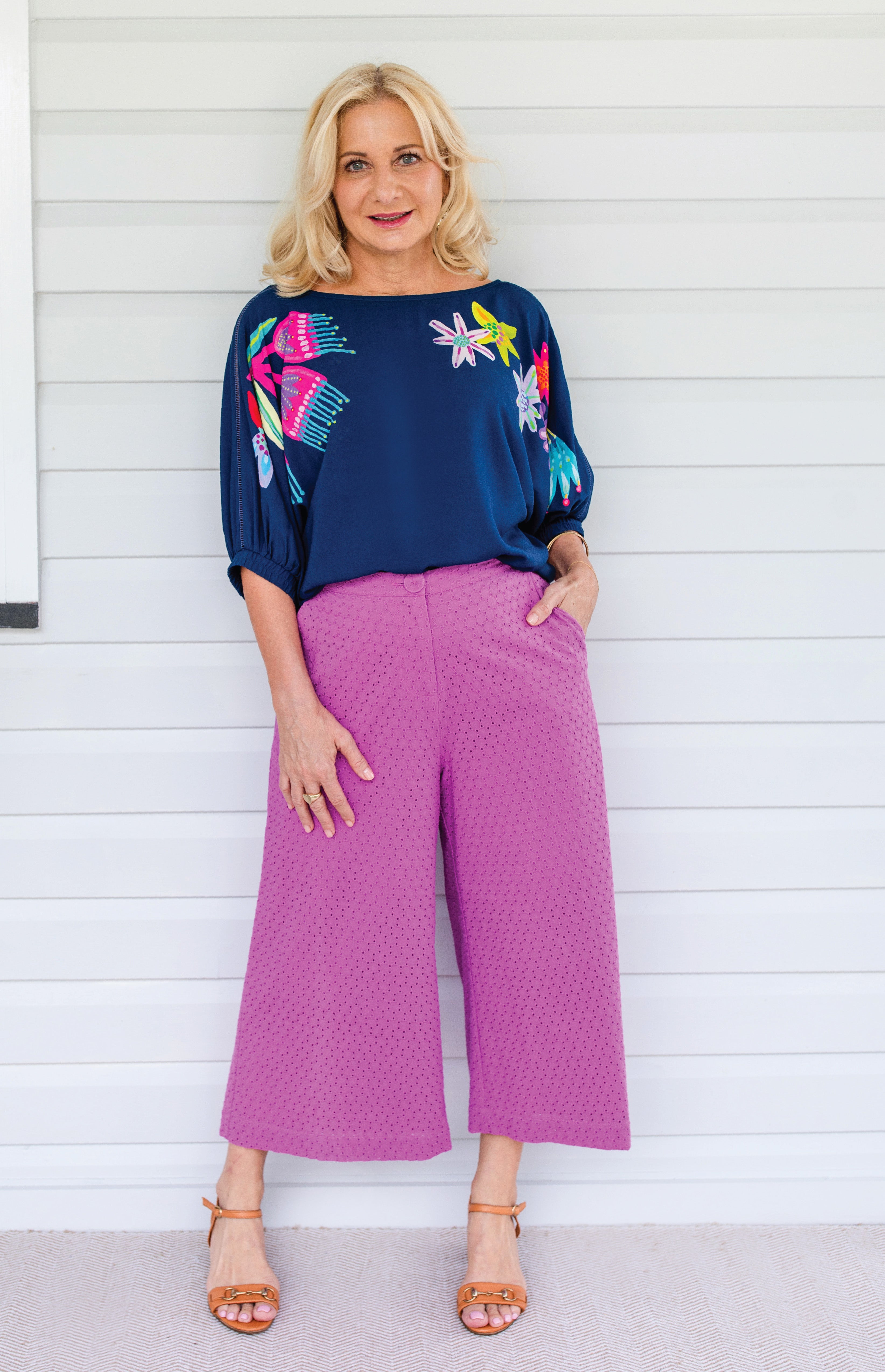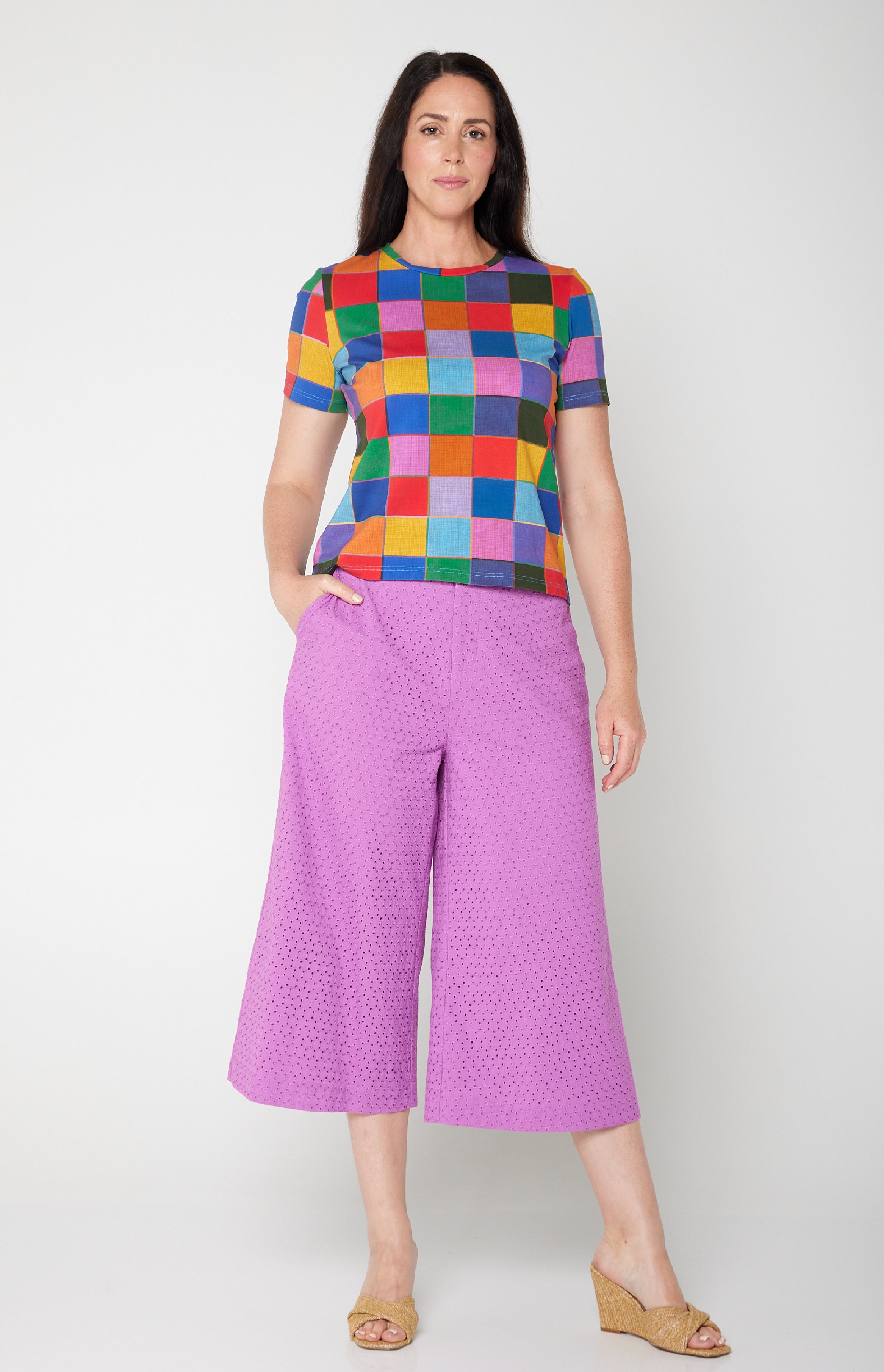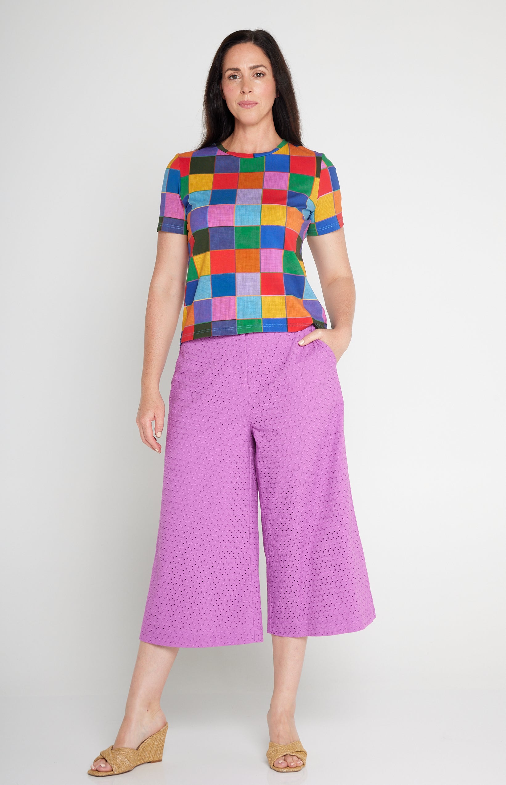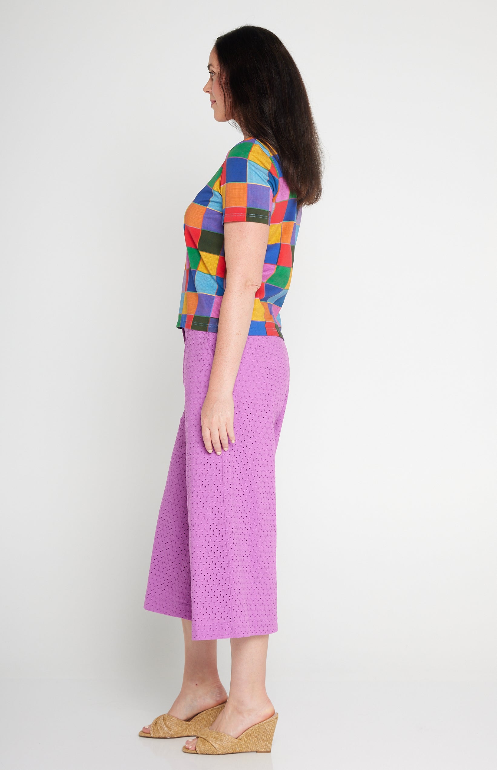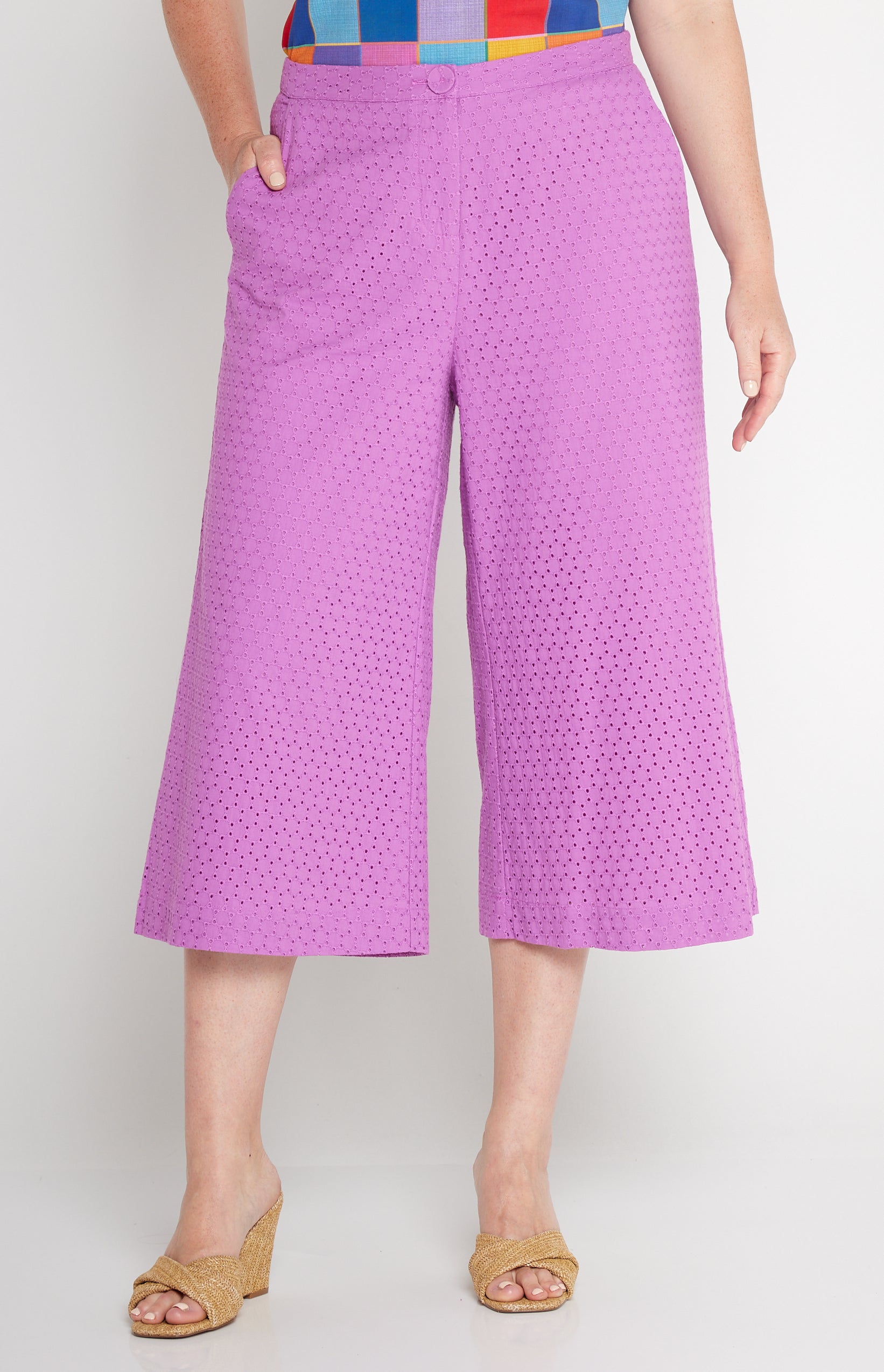 Step out in style and comfort in the Jane, she is the perfect wear anywhere pant, with her wide cropped leg. These ones are fashioned in a gorgeous lilac broderie lace.