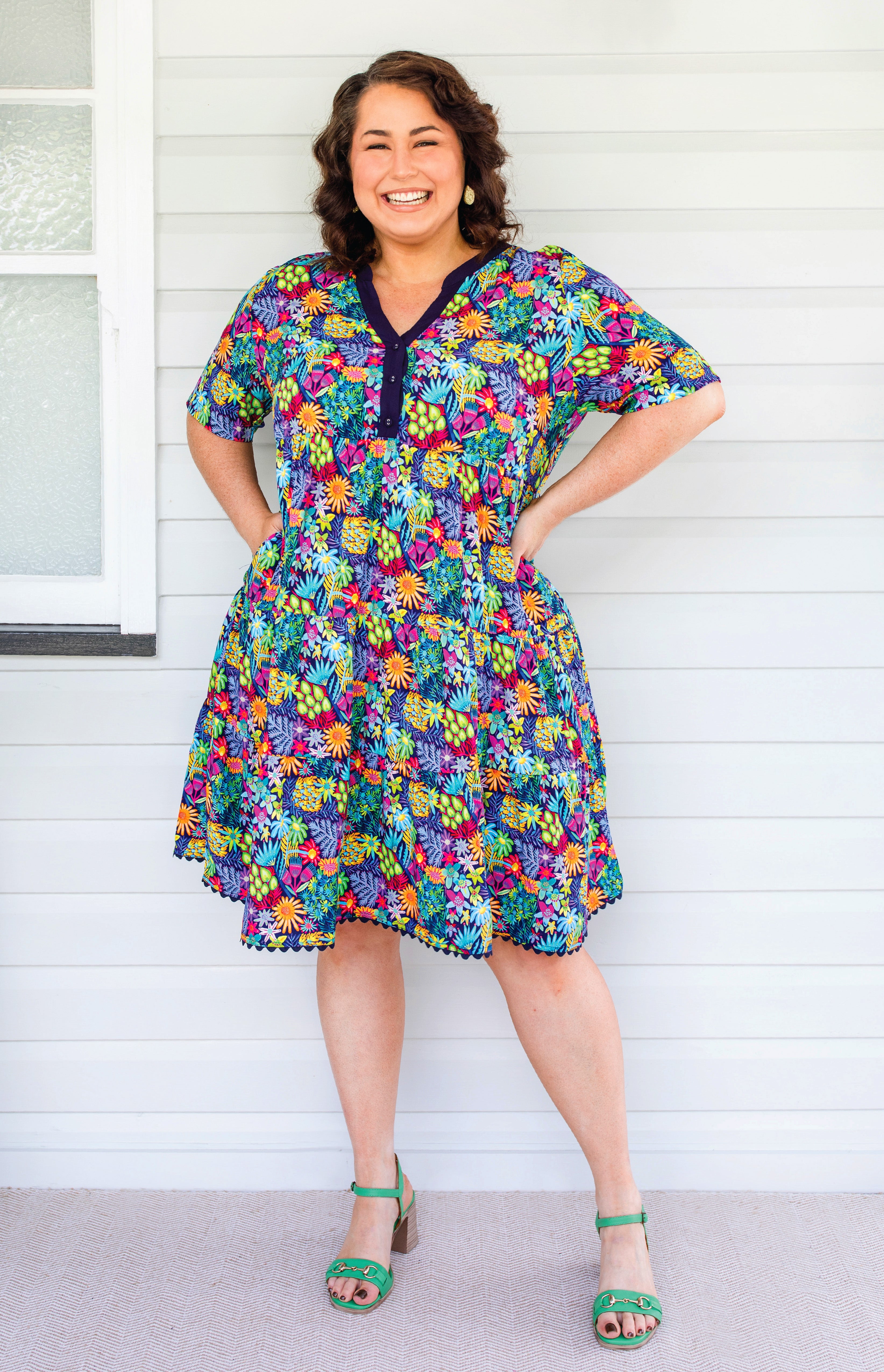 This dress is not as easy fitting as our Holiday Dress - if you are bigger in the bust or shoulders - then go up a size in this dress for an easier fit.