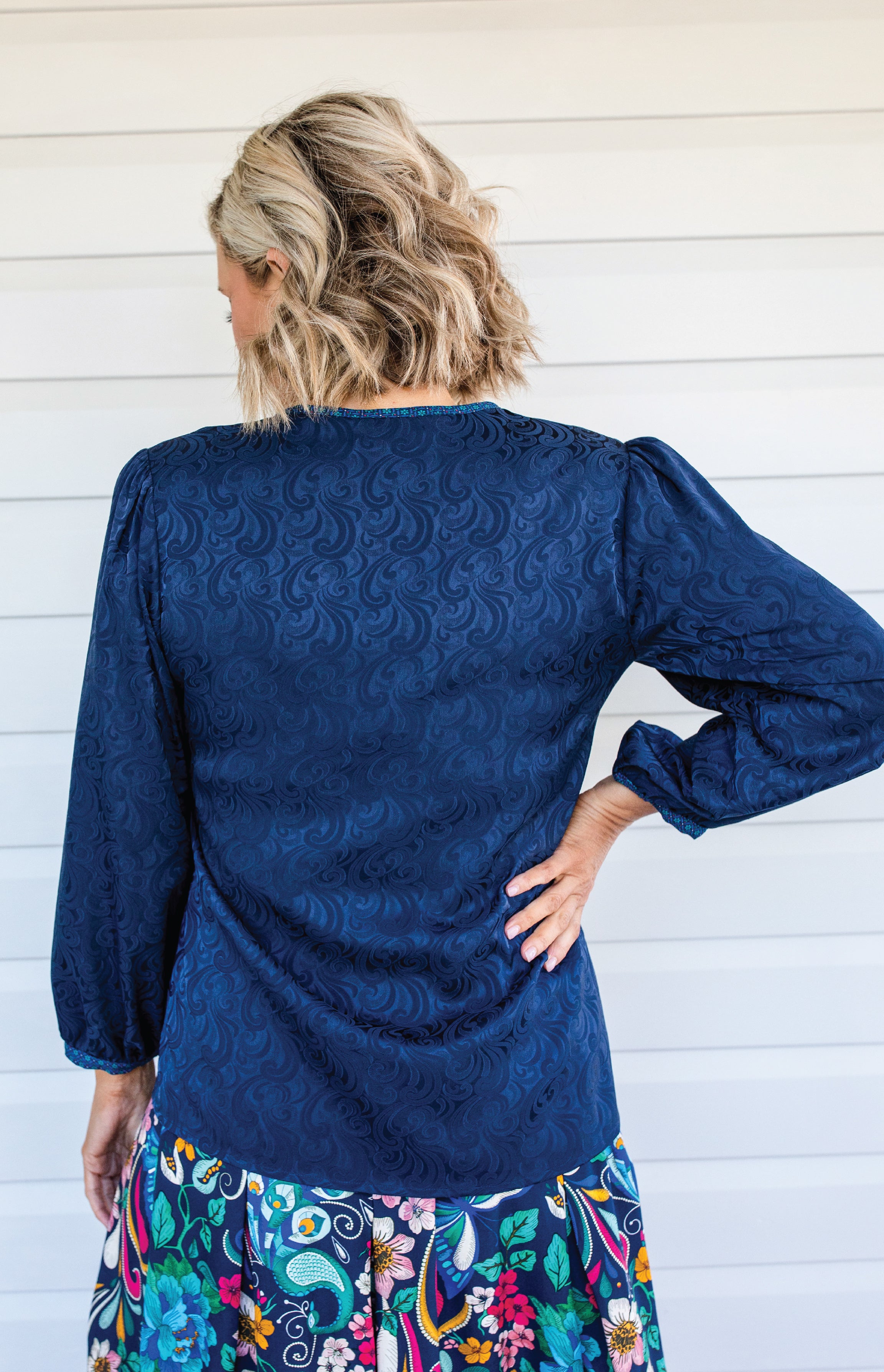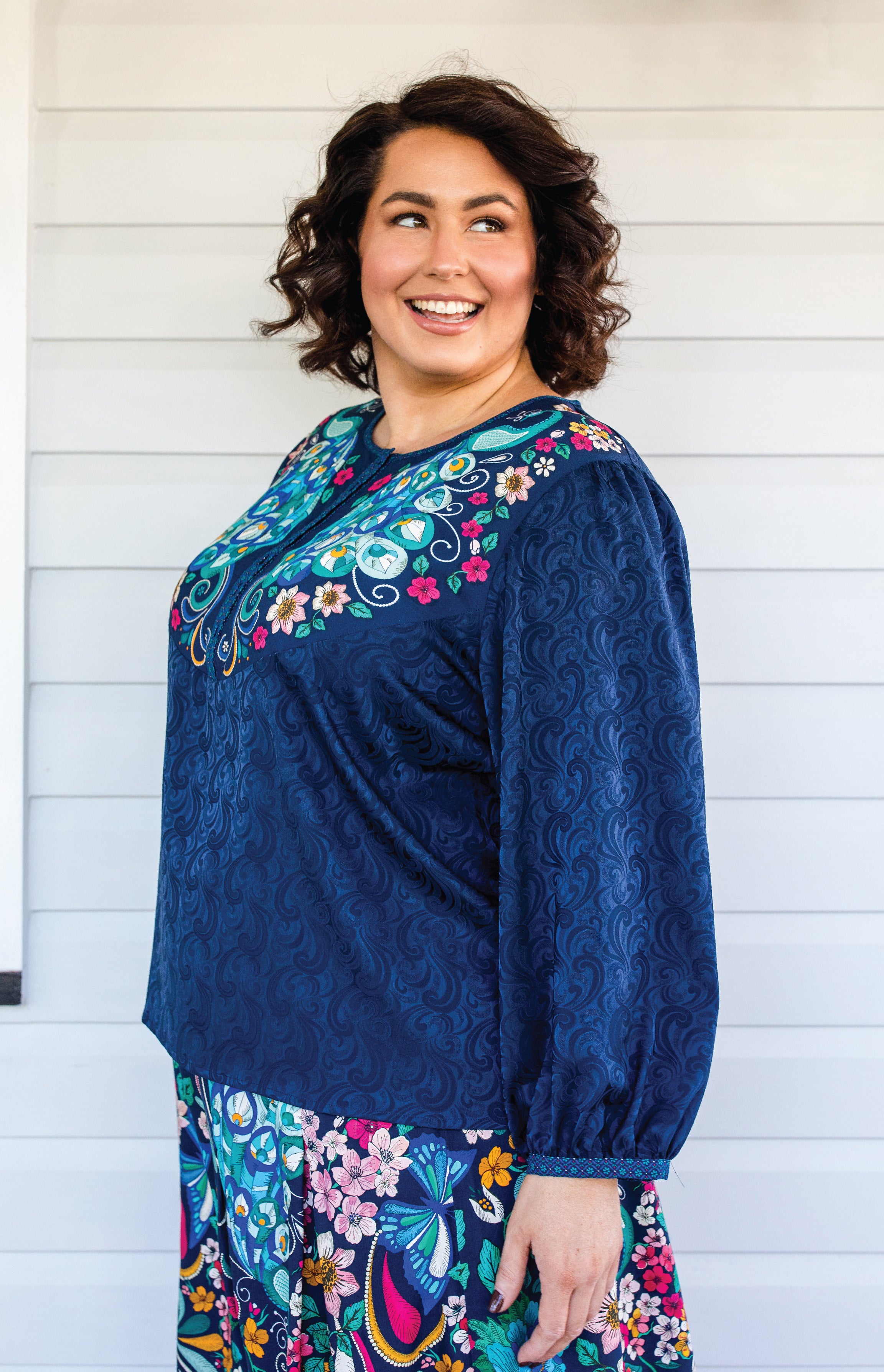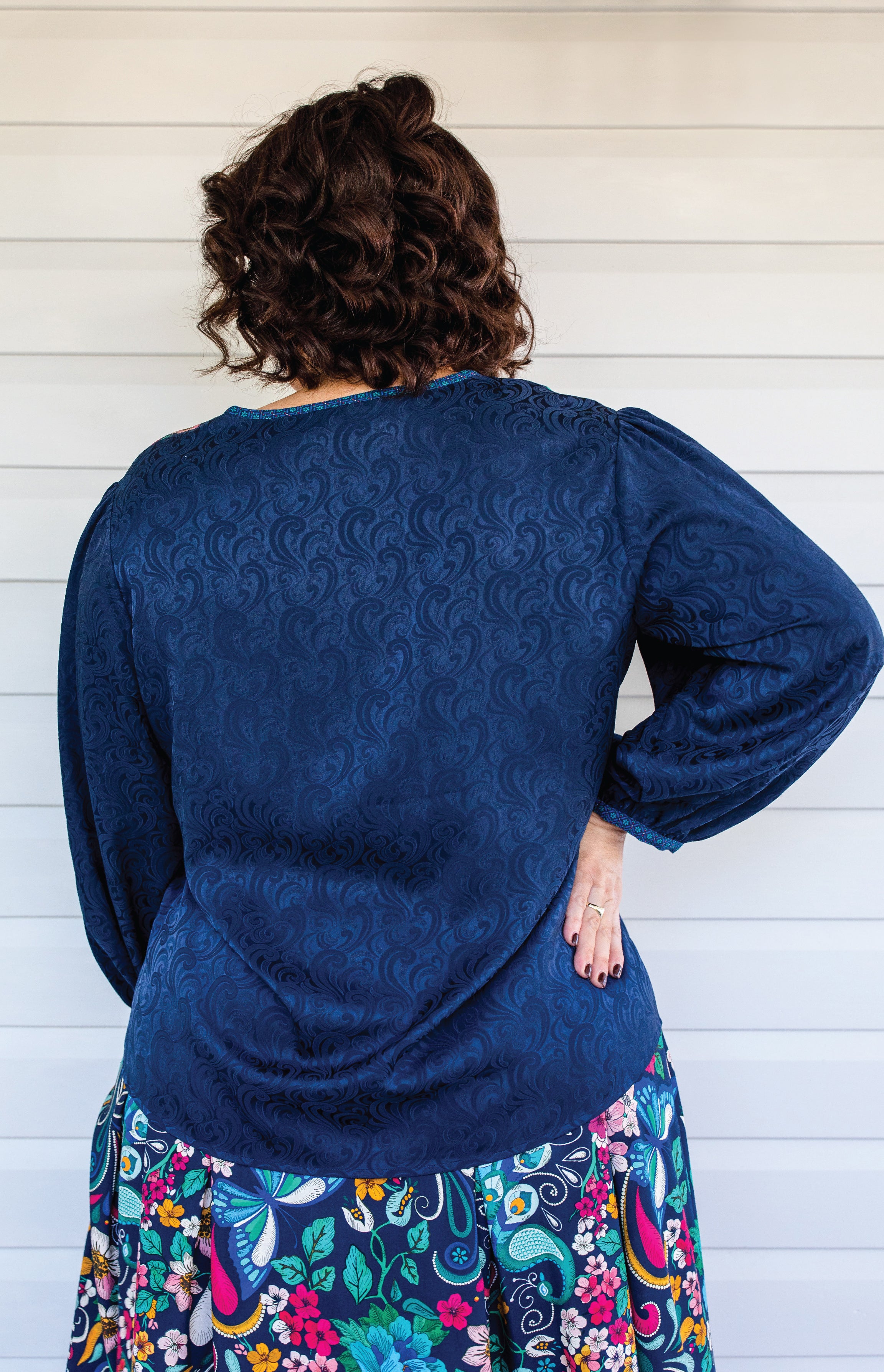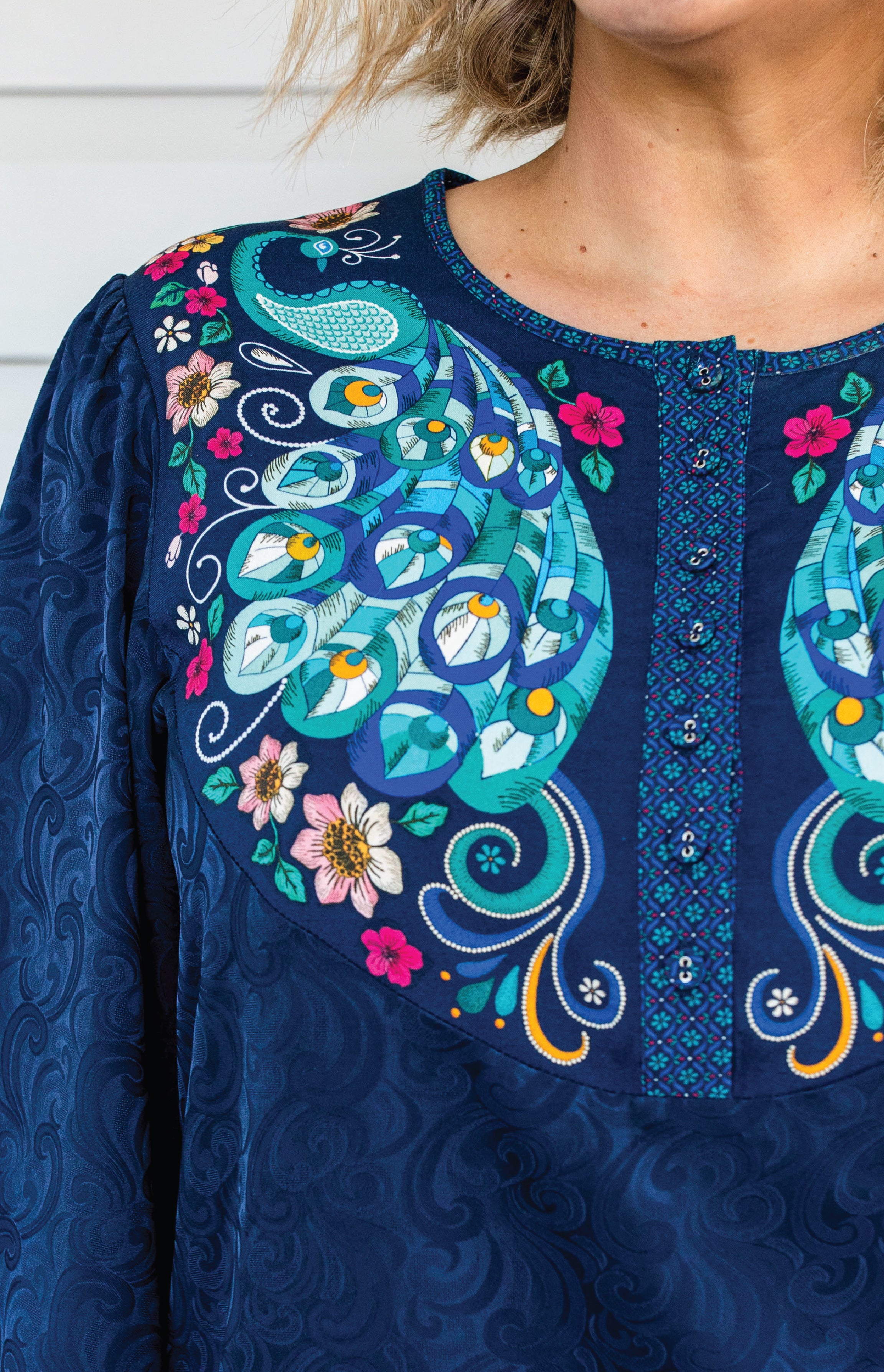 This top has a placement cut yoke design, which means each top has the exact same design, featuring elements from our exclusive Truly Madly print. The fabric of the top is in a luxe textured satin fabric.