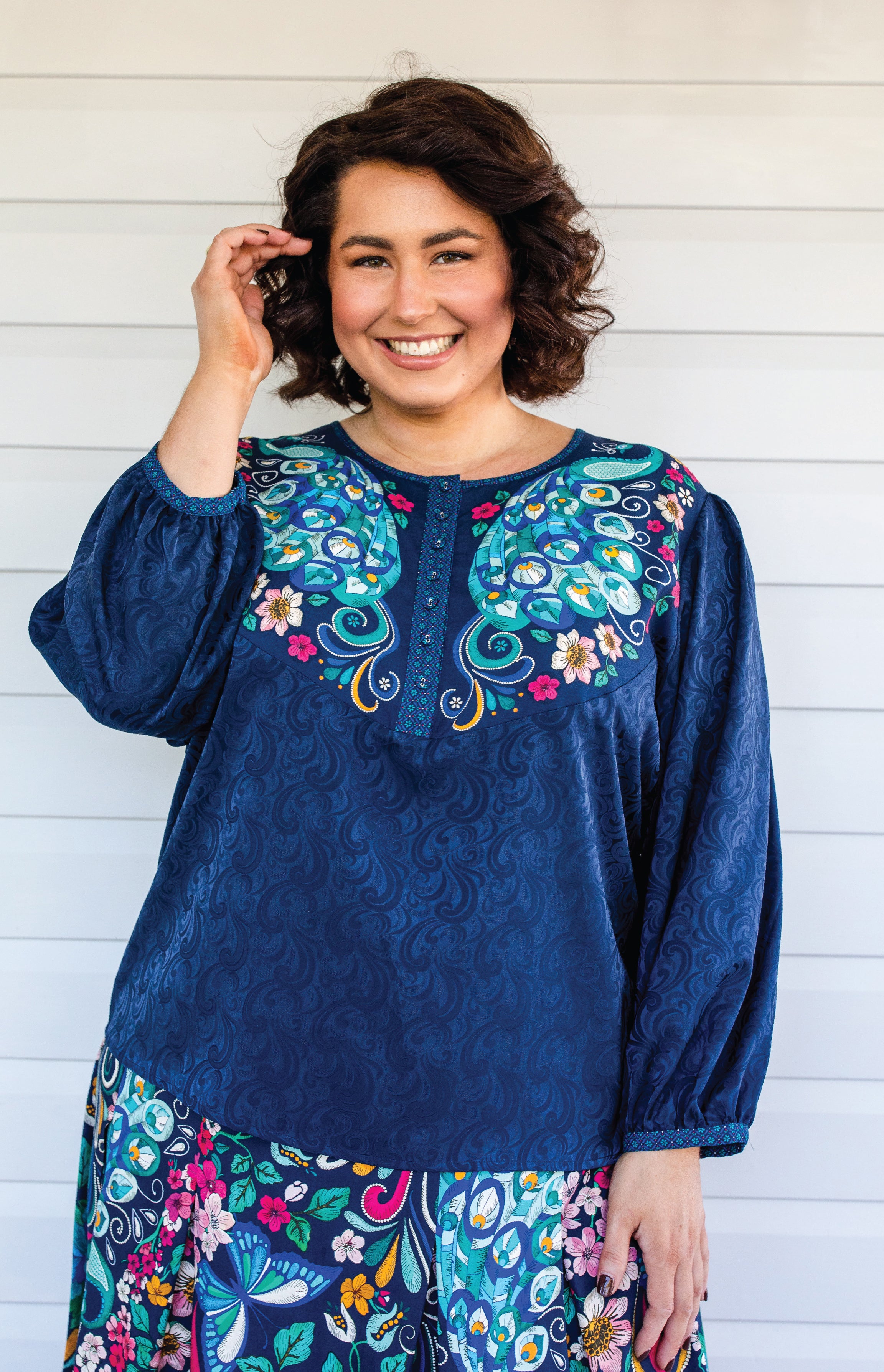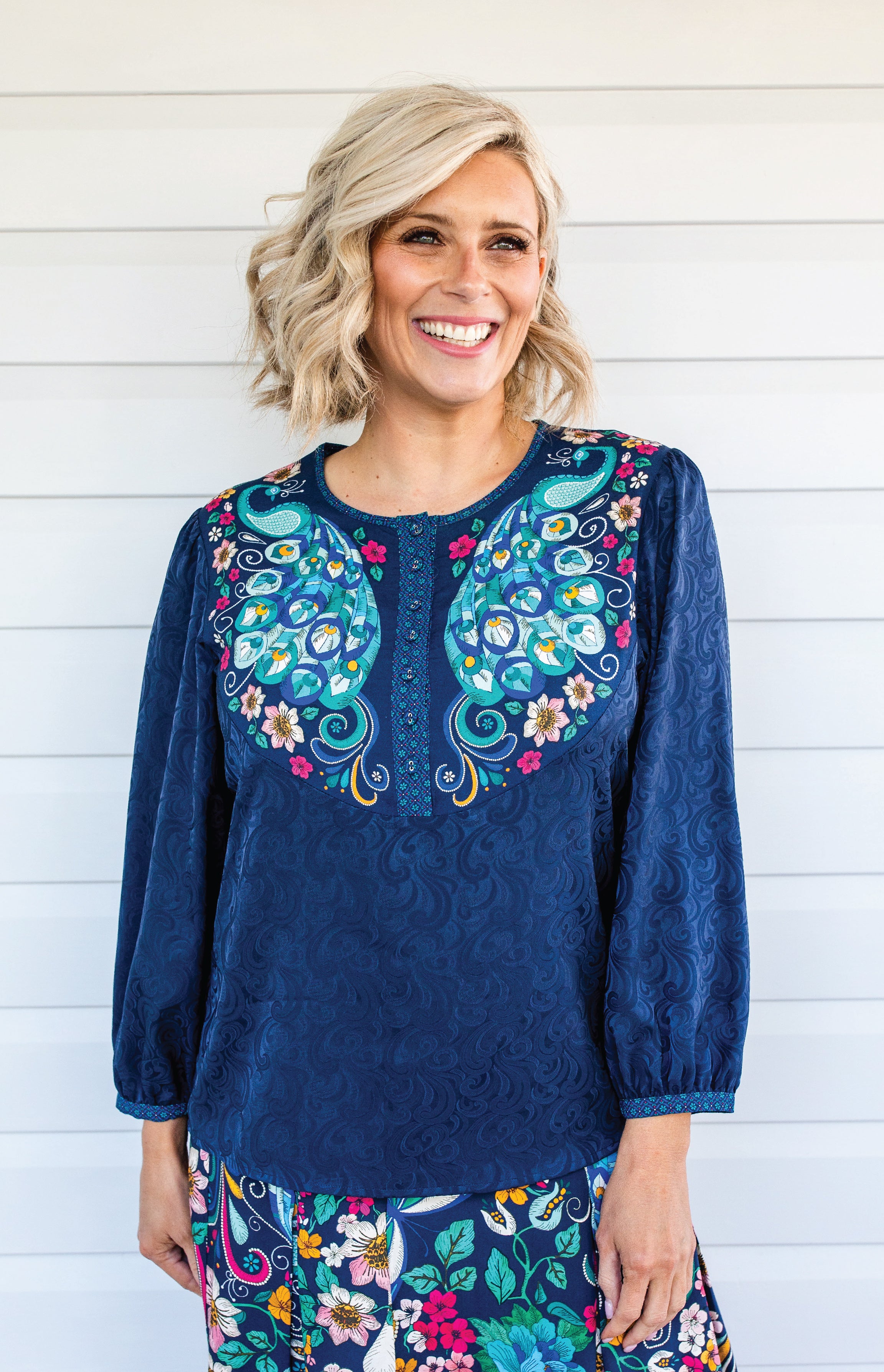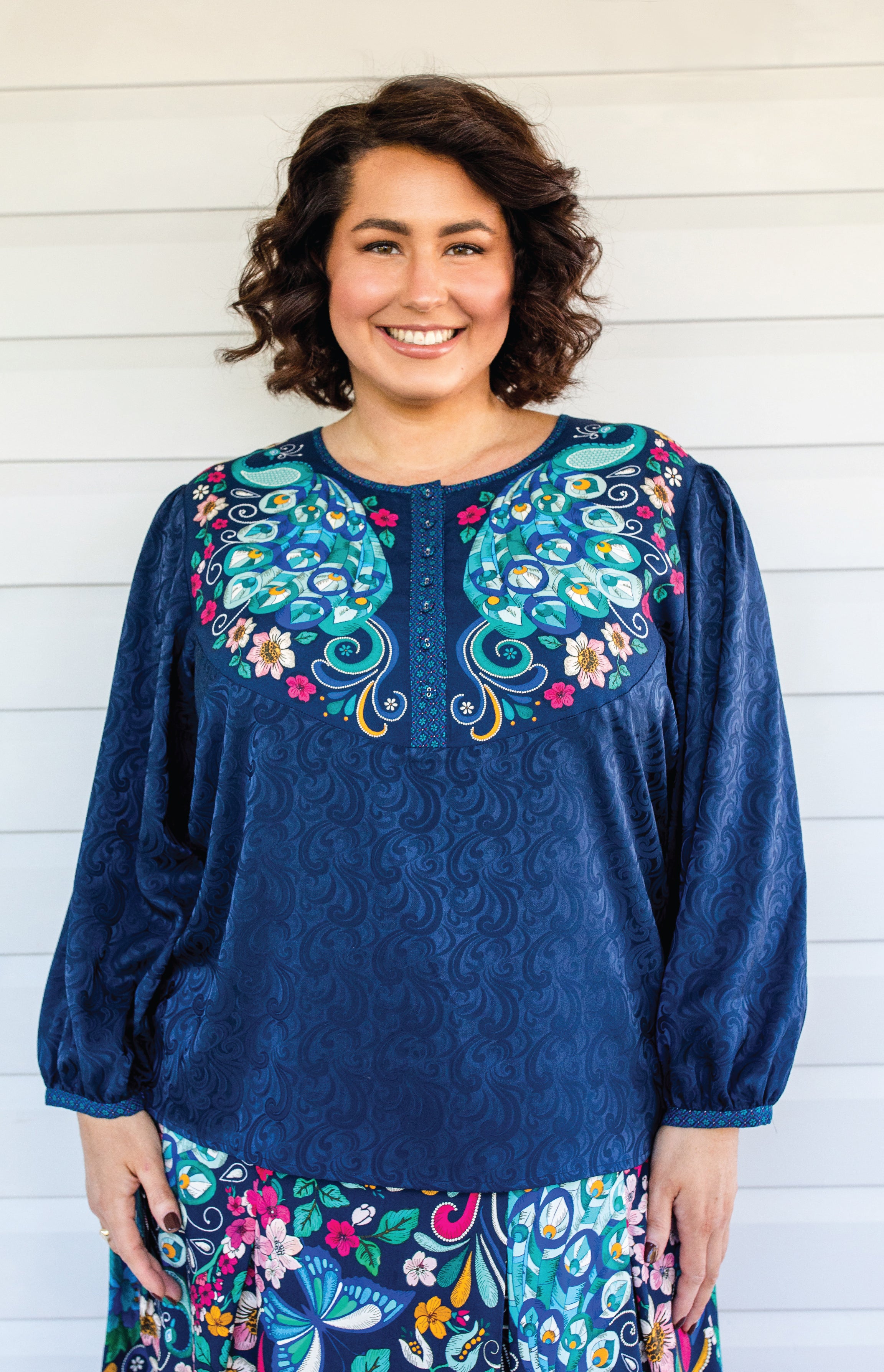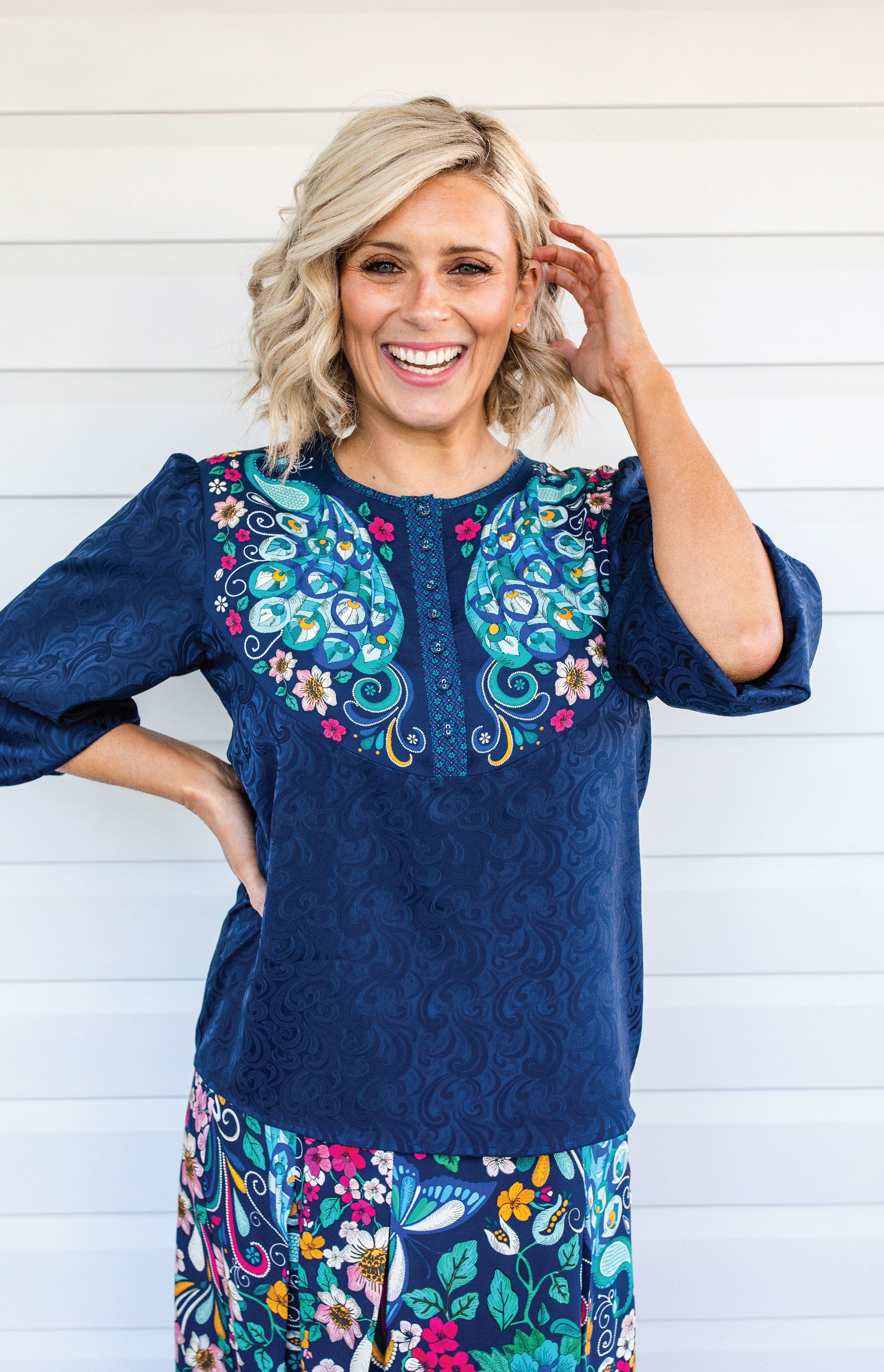 This top has a placement cut yoke design, which means each top has the exact same design, featuring elements from our exclusive Truly Madly print. The fabric of the top is in a luxe textured satin fabric.