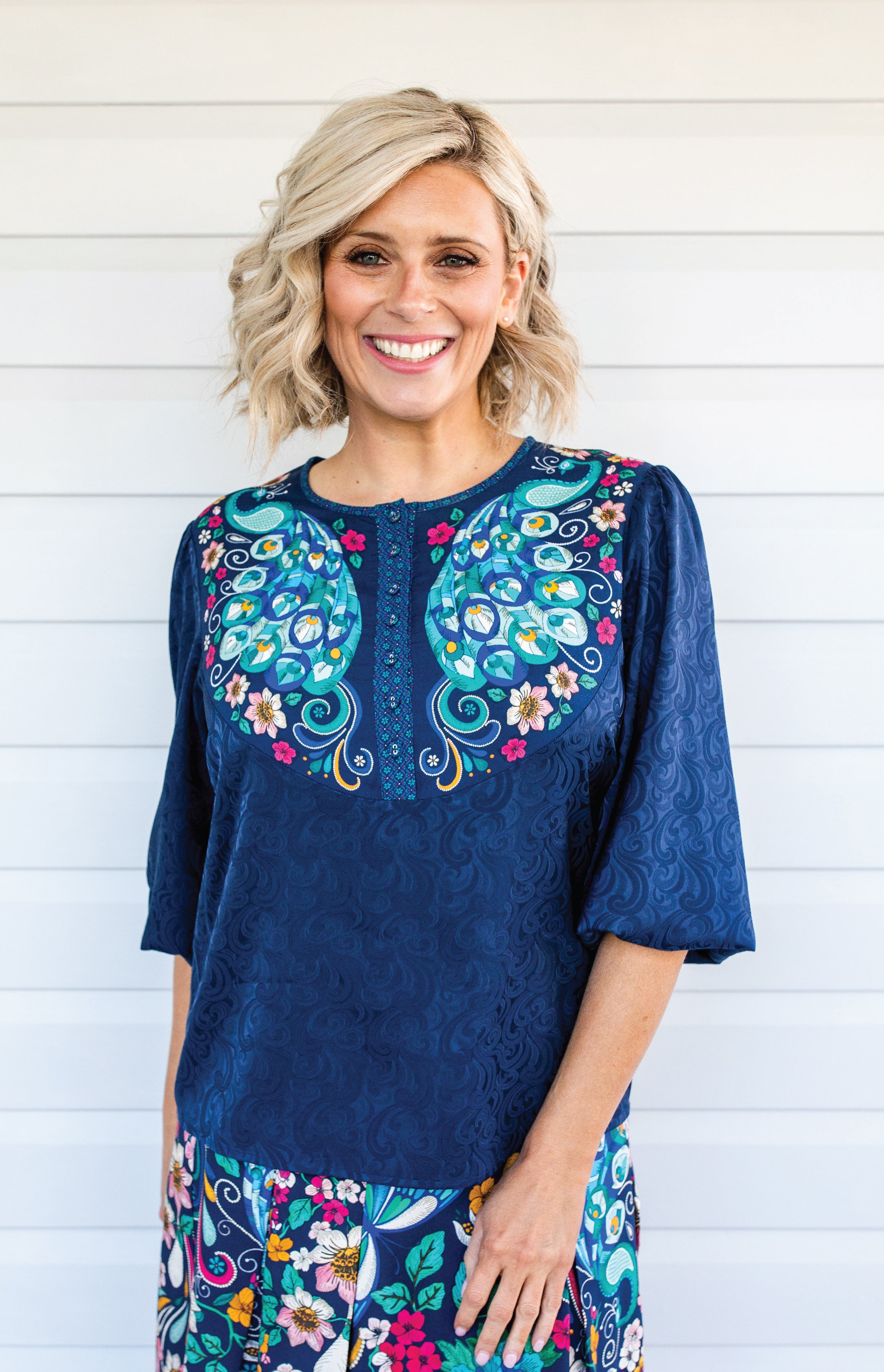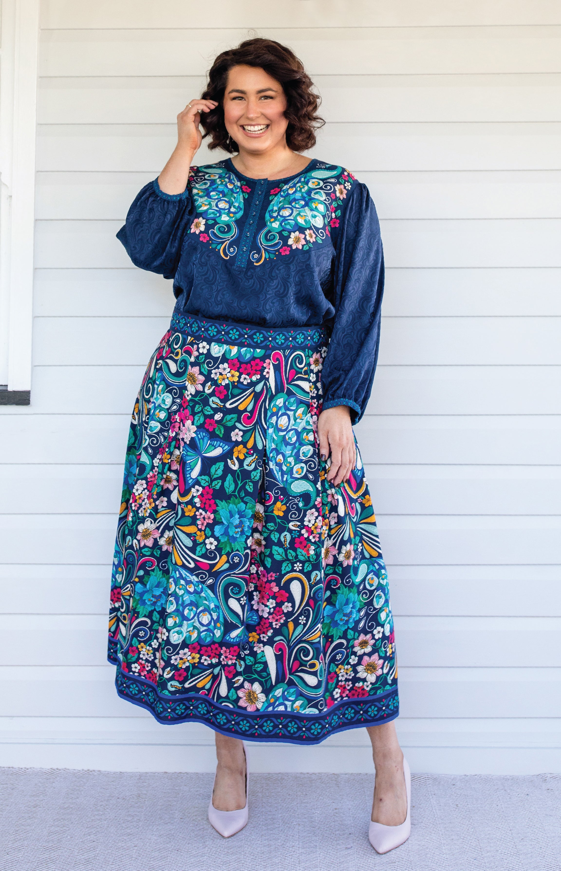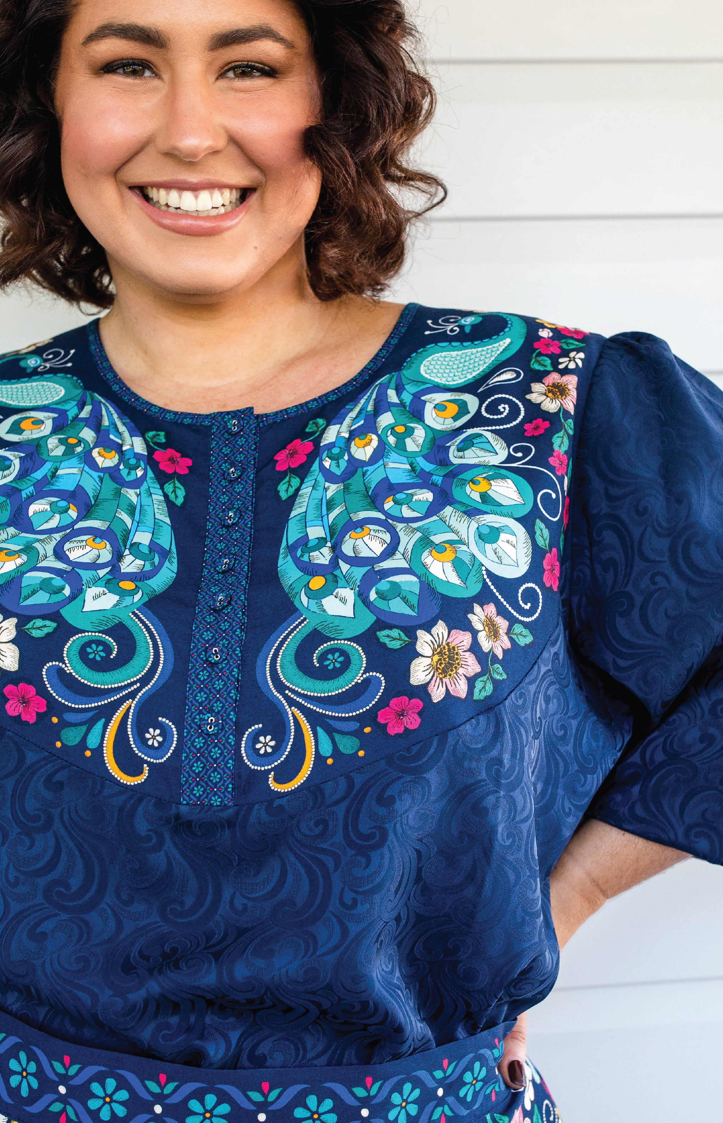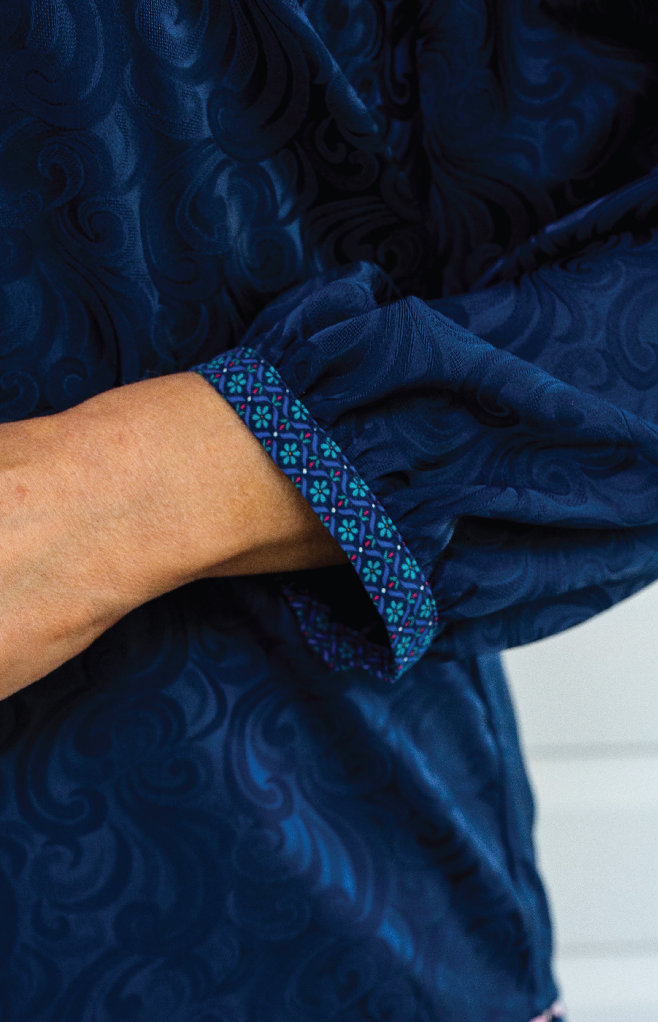 This top has a placement cut yoke design, which means each top has the exact same design, featuring elements from our exclusive Truly Madly print. The fabric of the top is in a luxe textured satin fabric.