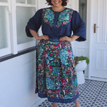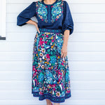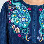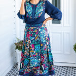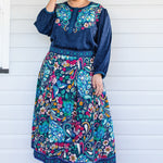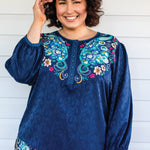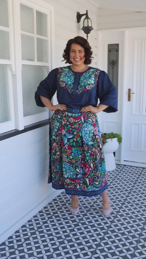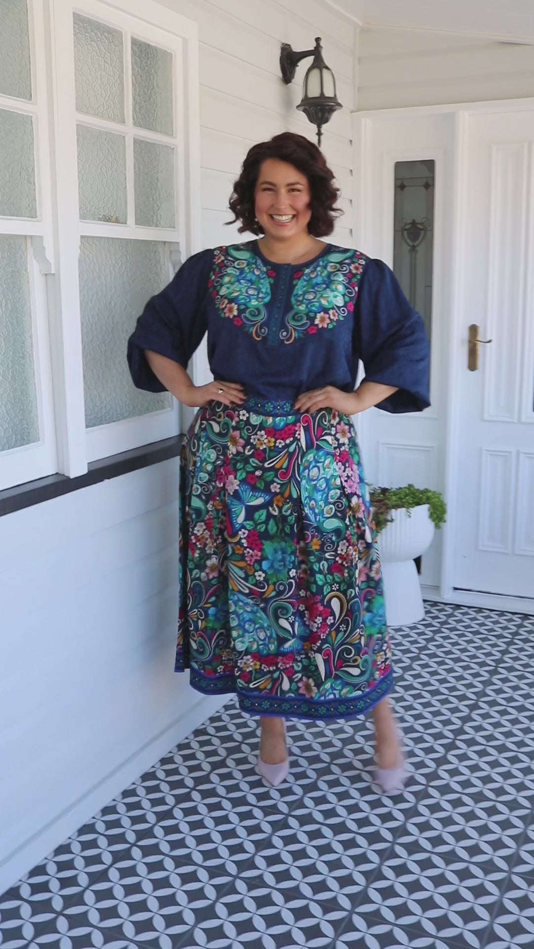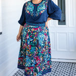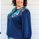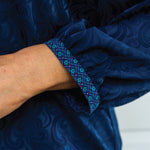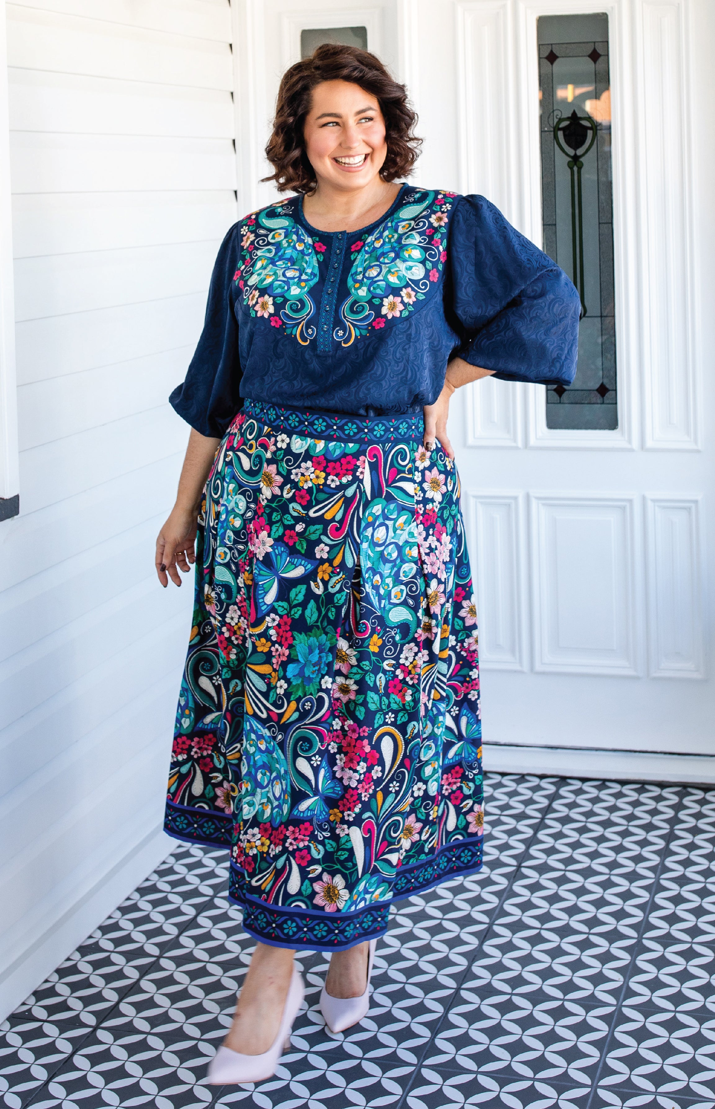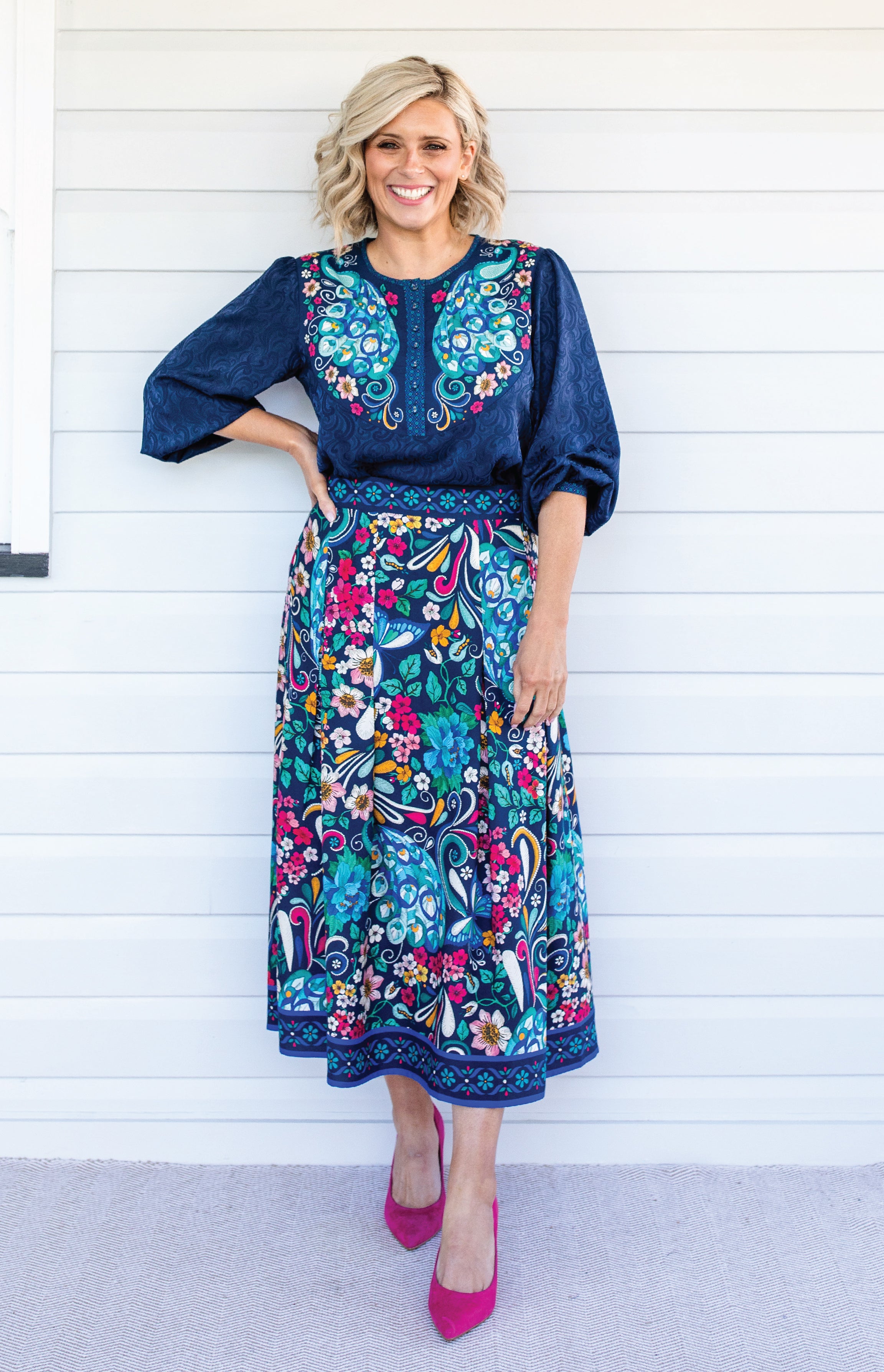 This top has a placement cut yoke design, which means each top has the exact same design, featuring elements from our exclusive Truly Madly print. The fabric of the top is in a luxe textured satin fabric.