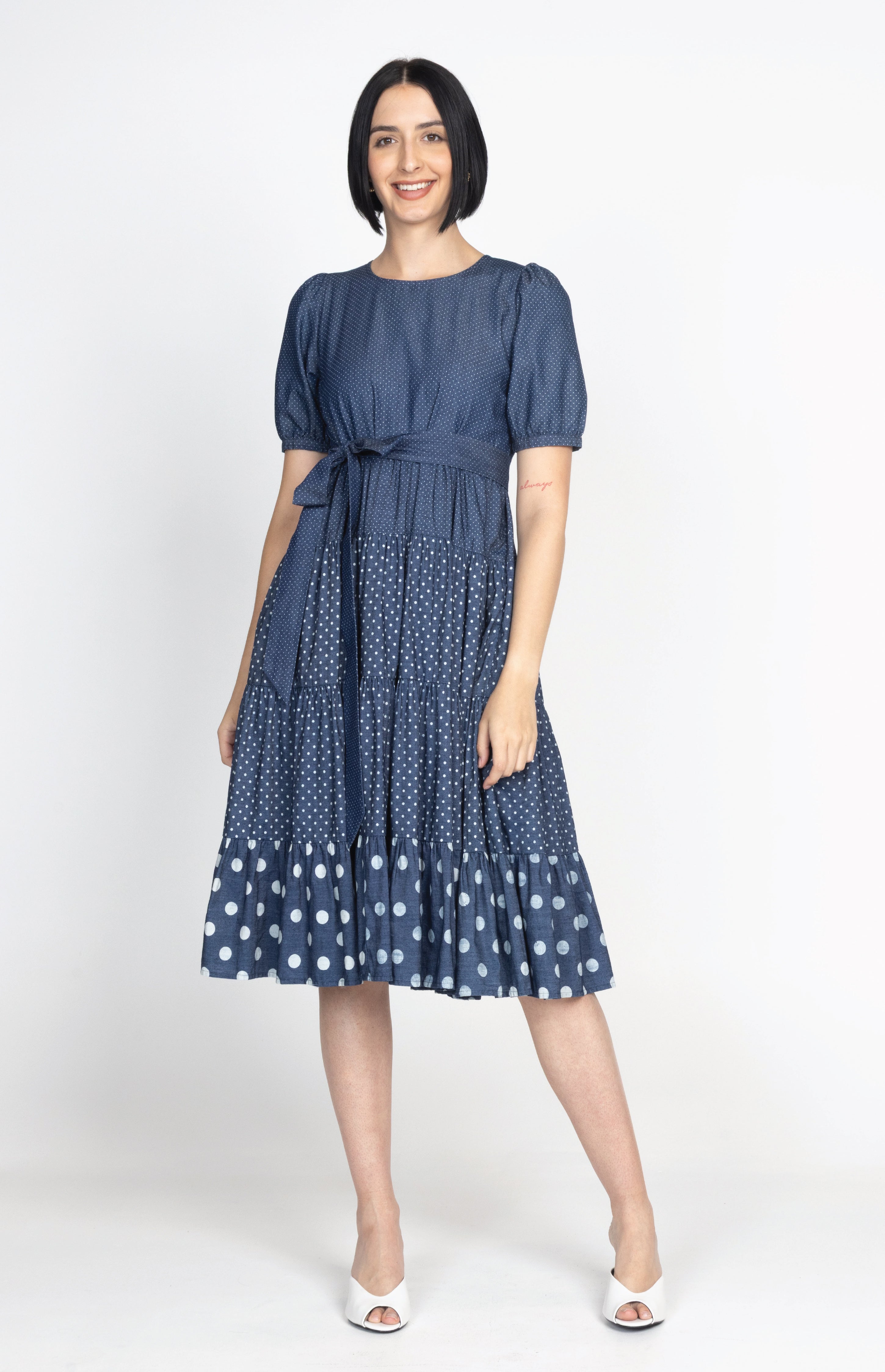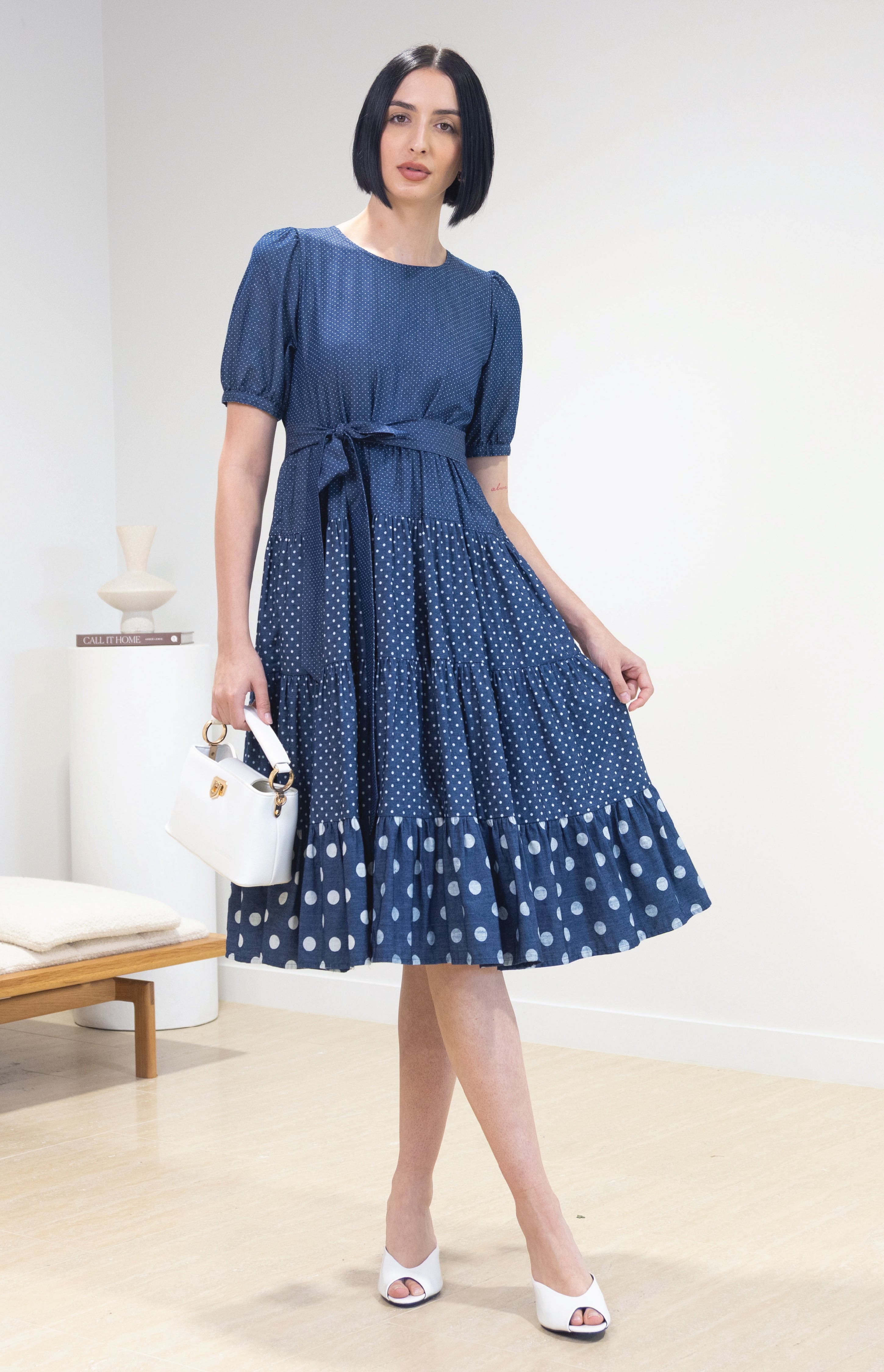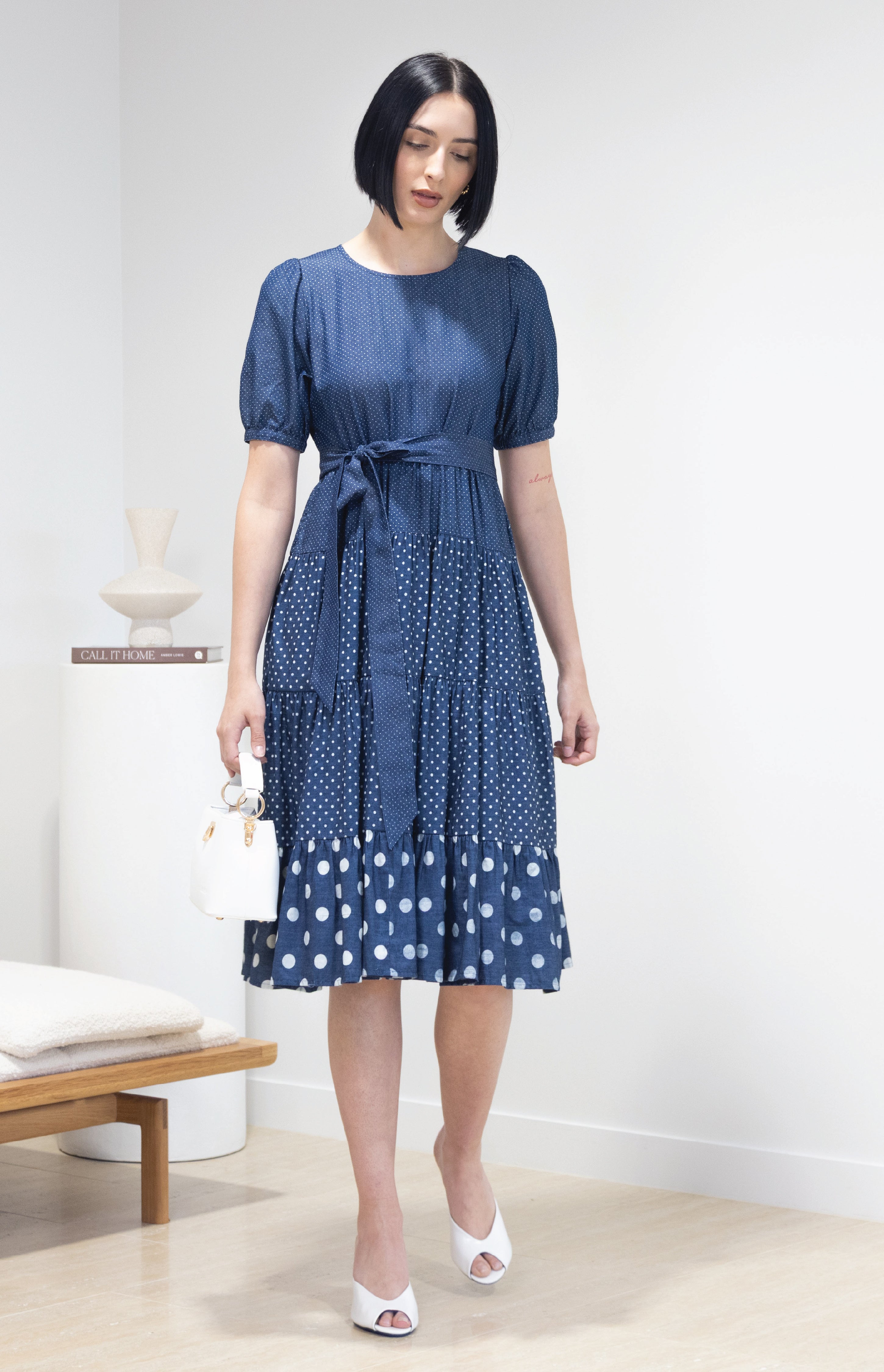 Crafted from 100% cotton denim with super cute polka dots, she features sweet puffed sleeves and an easy to wear silhouette. Even better? She has pockets and a matching separate tie belt!
