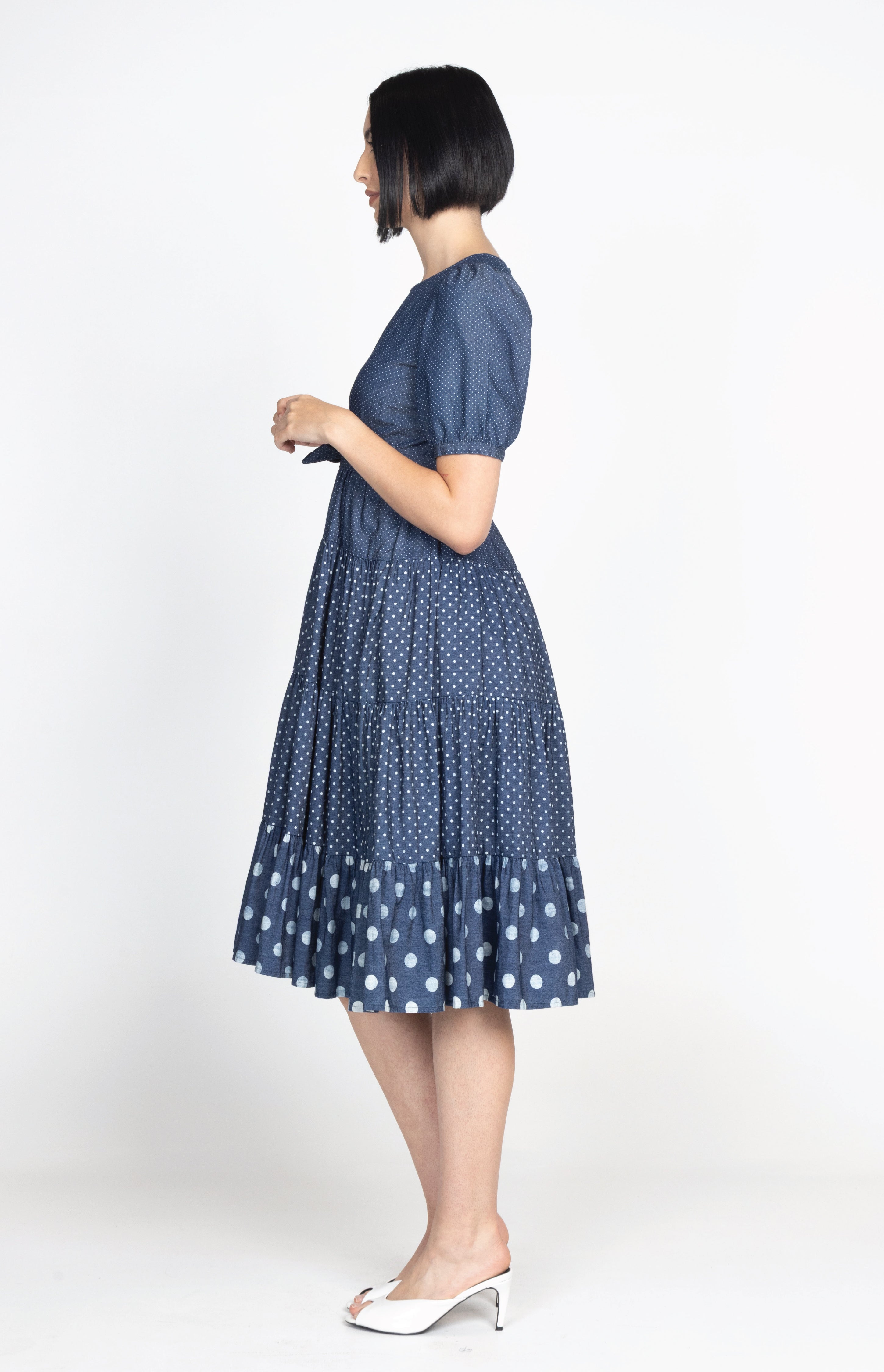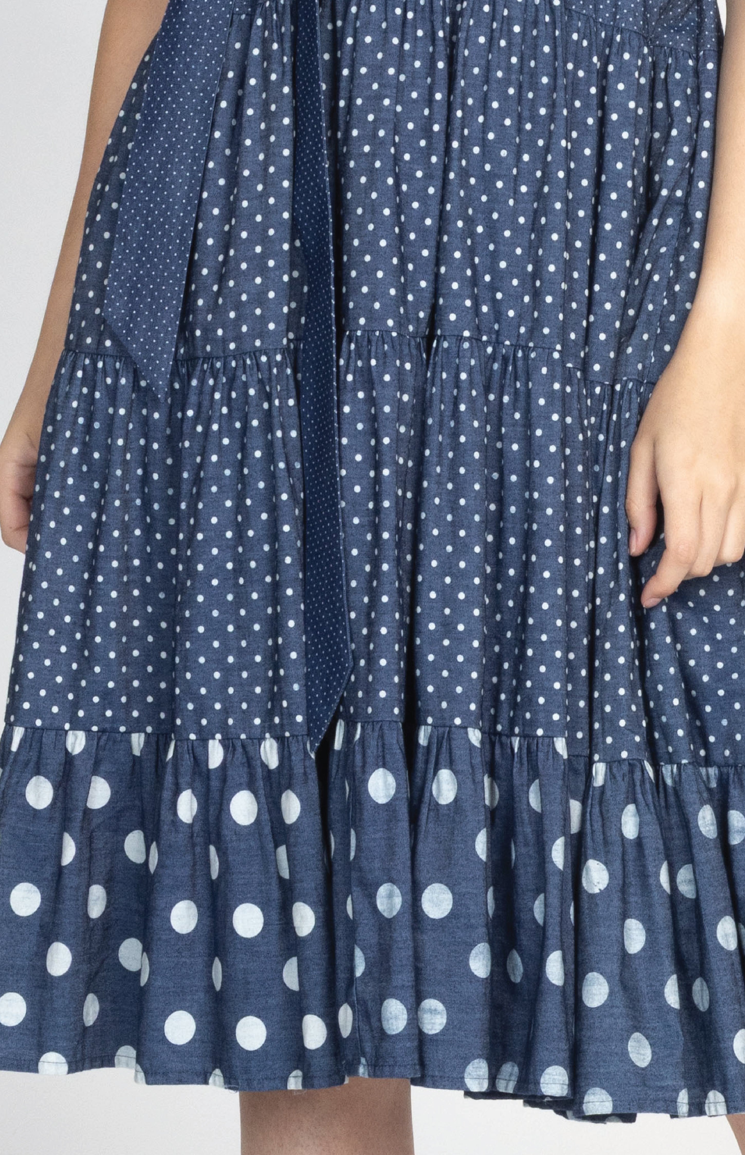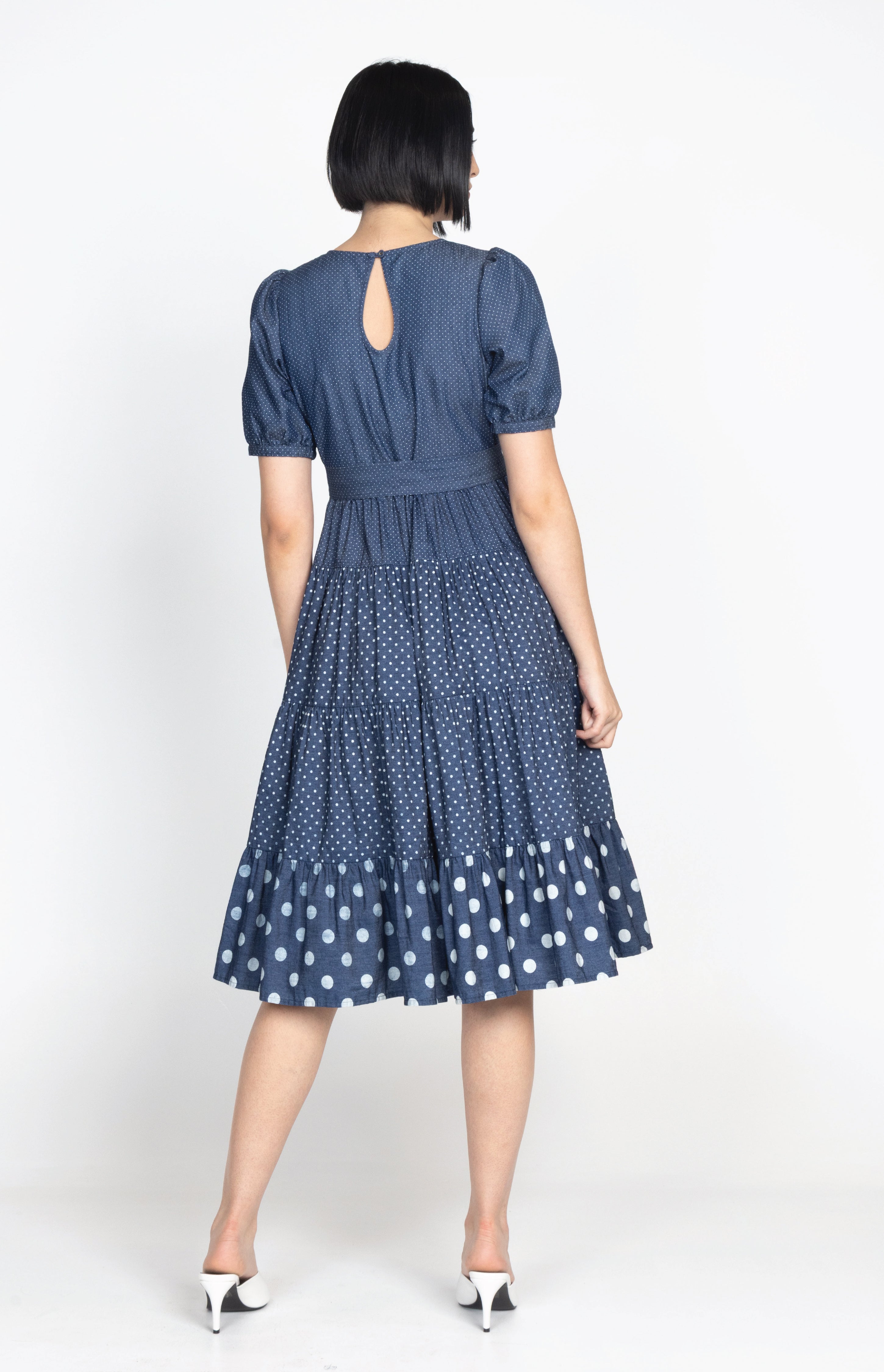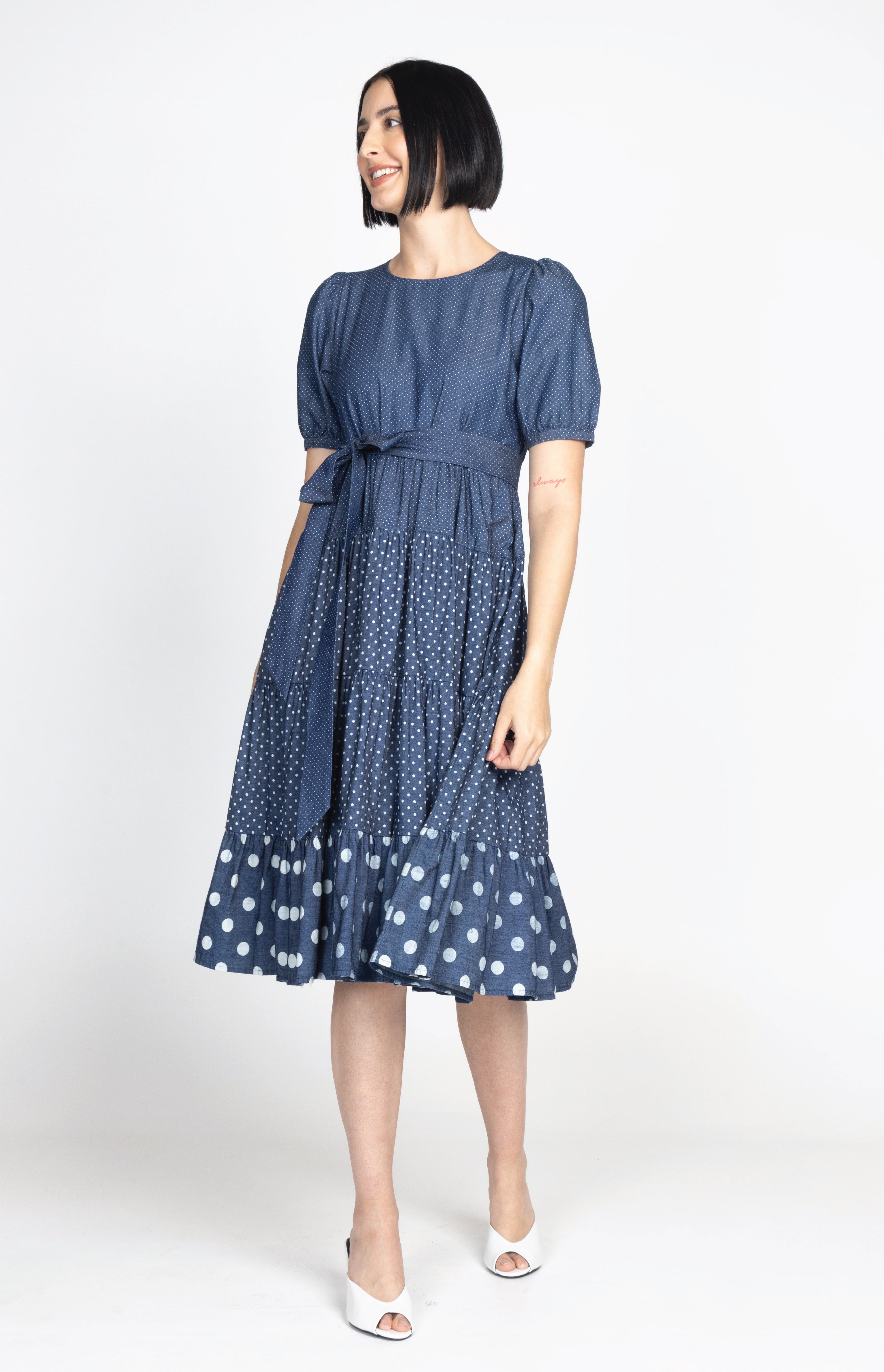 Crafted from 100% cotton denim with super cute polka dots, she features sweet puffed sleeves and an easy to wear silhouette. Even better? She has pockets and a matching separate tie belt!