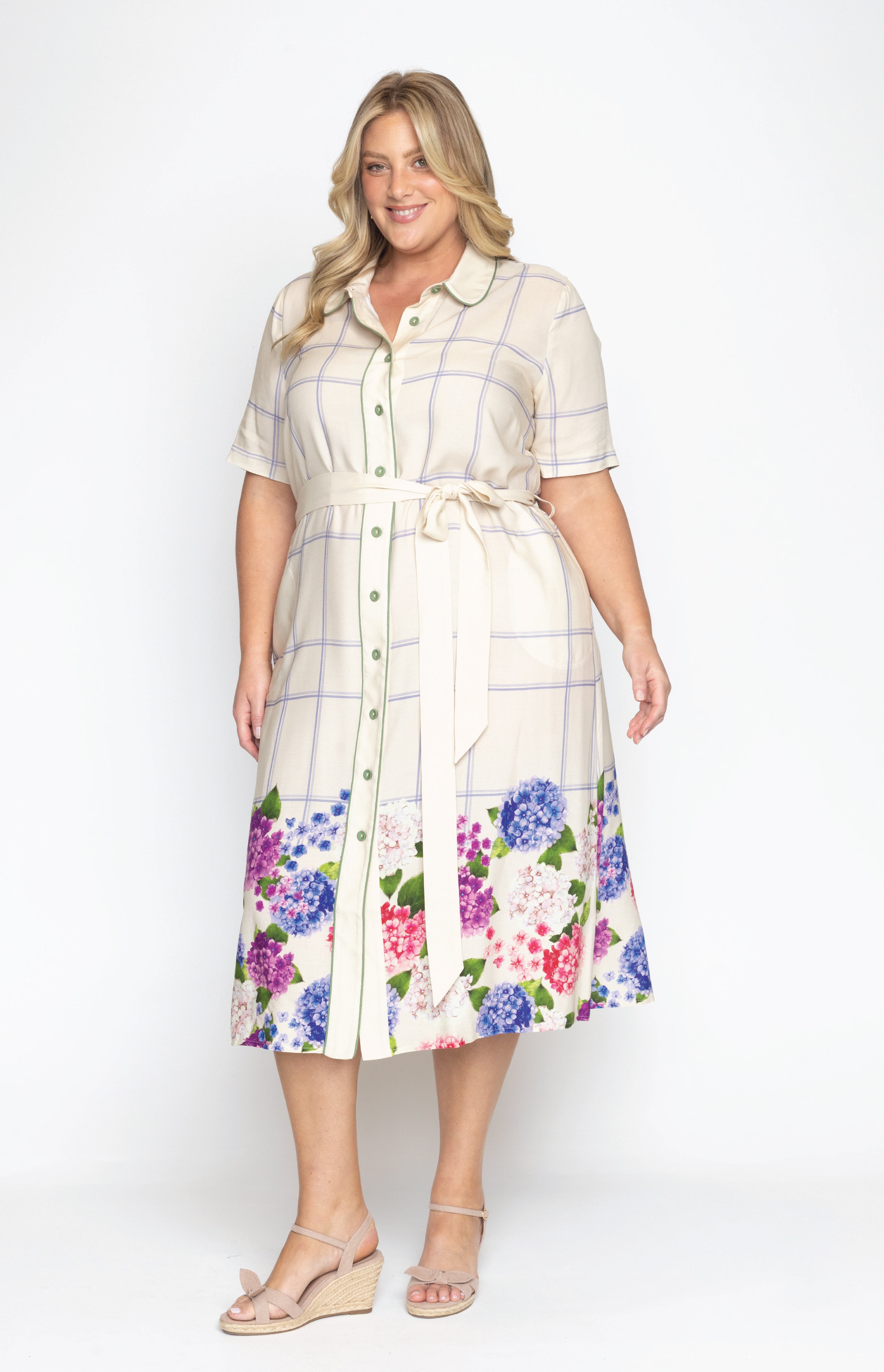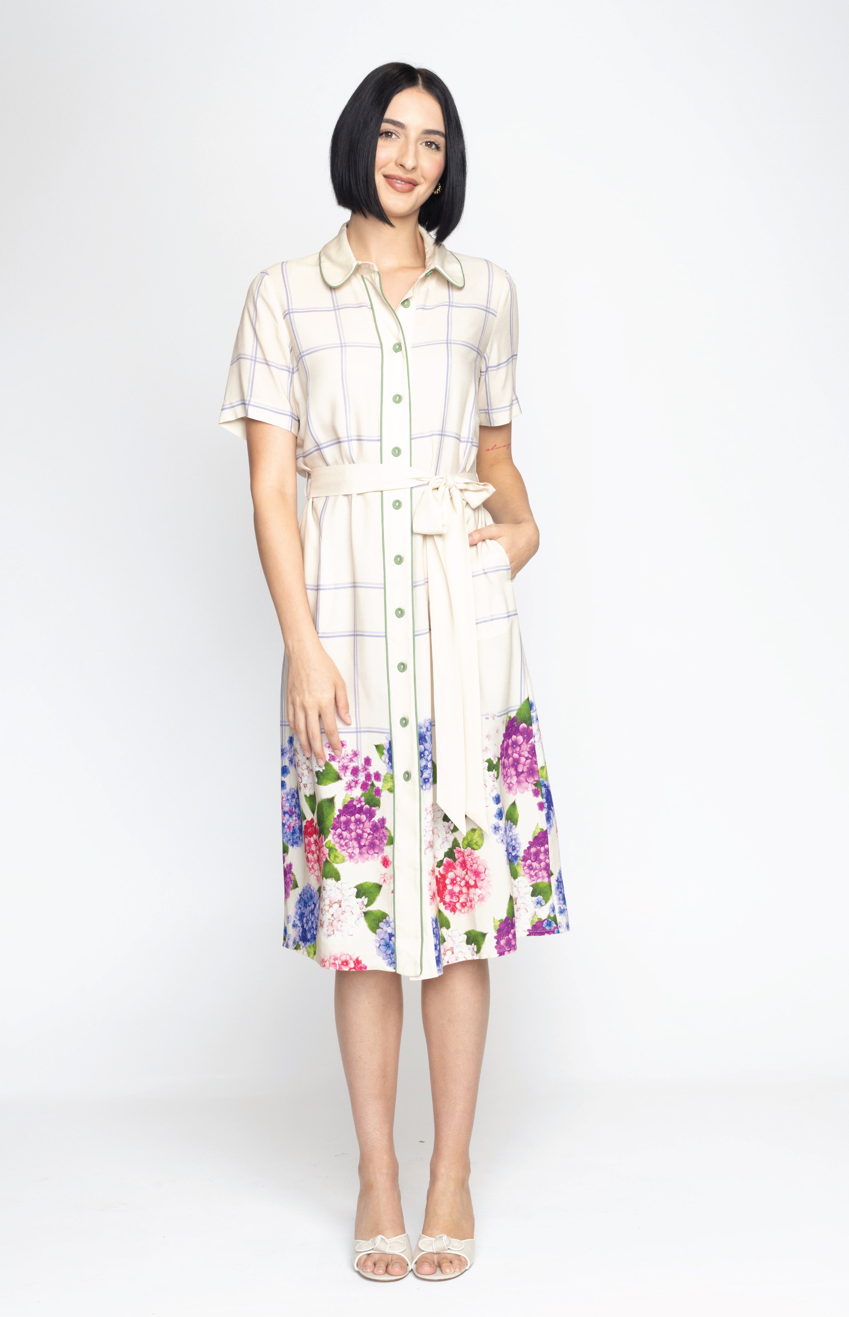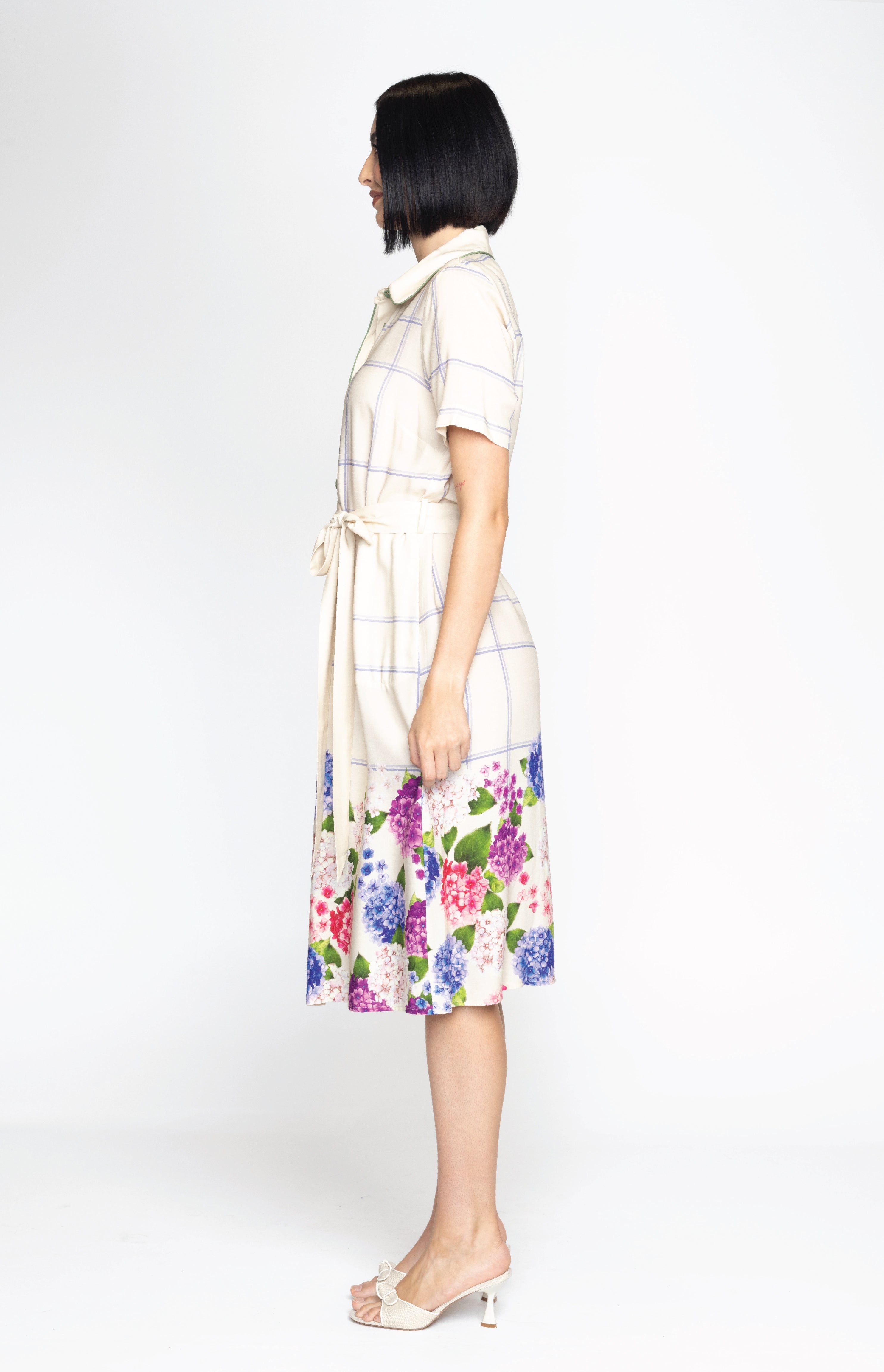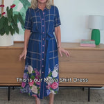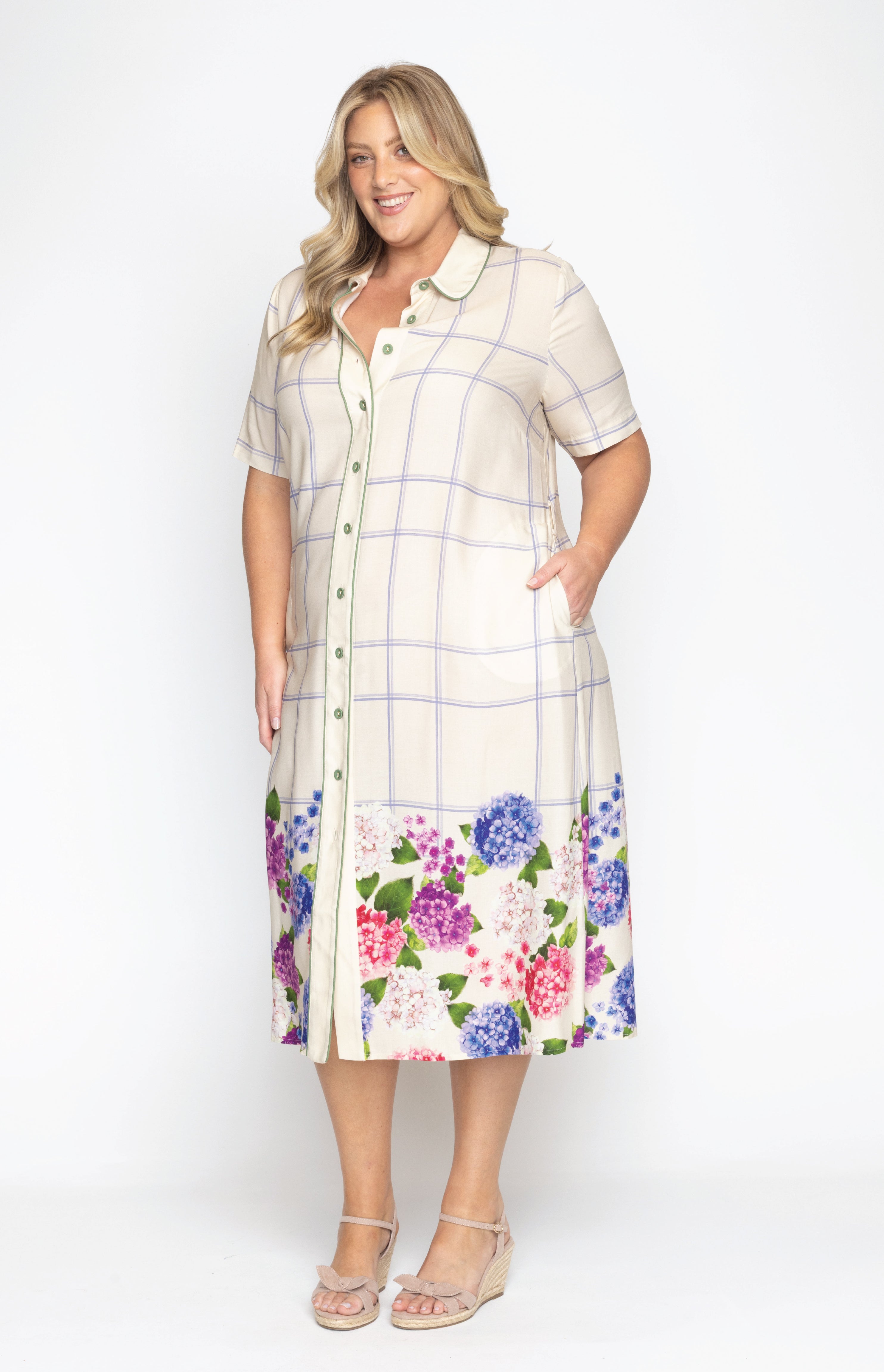 This frock is a fitted traditional shirt dress style, and we have created a contrast hem design featuring our hand-painted florals.