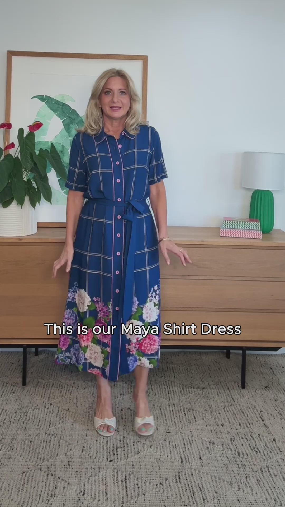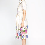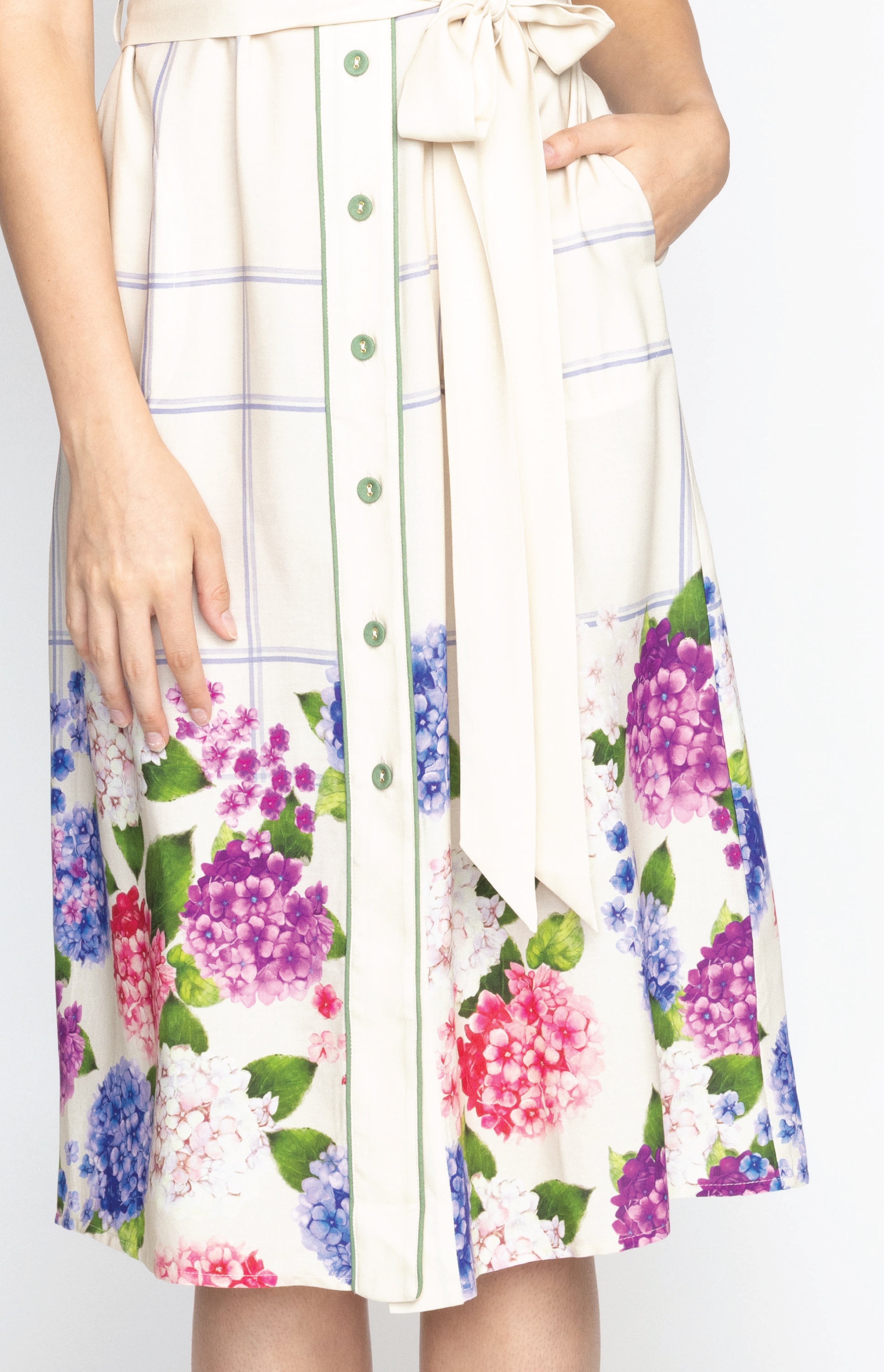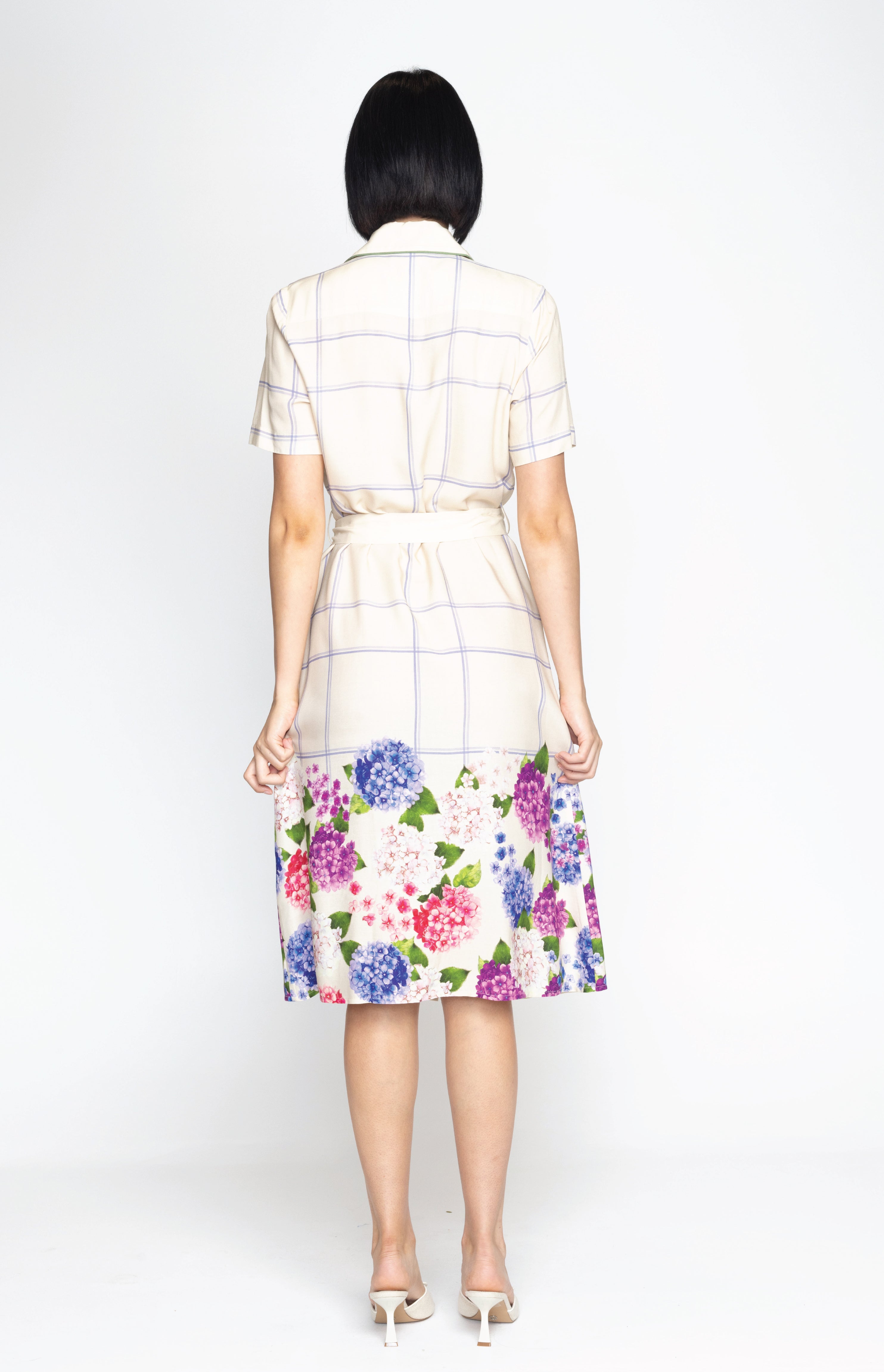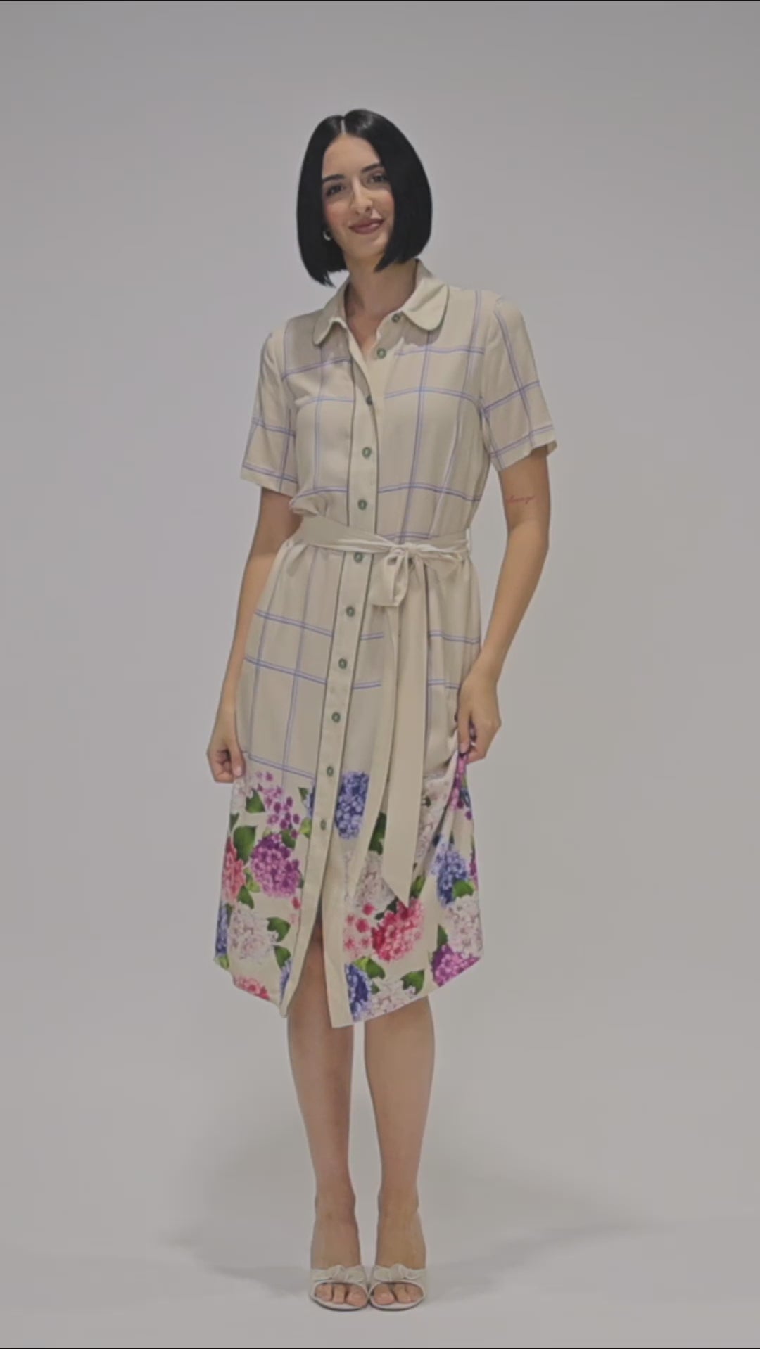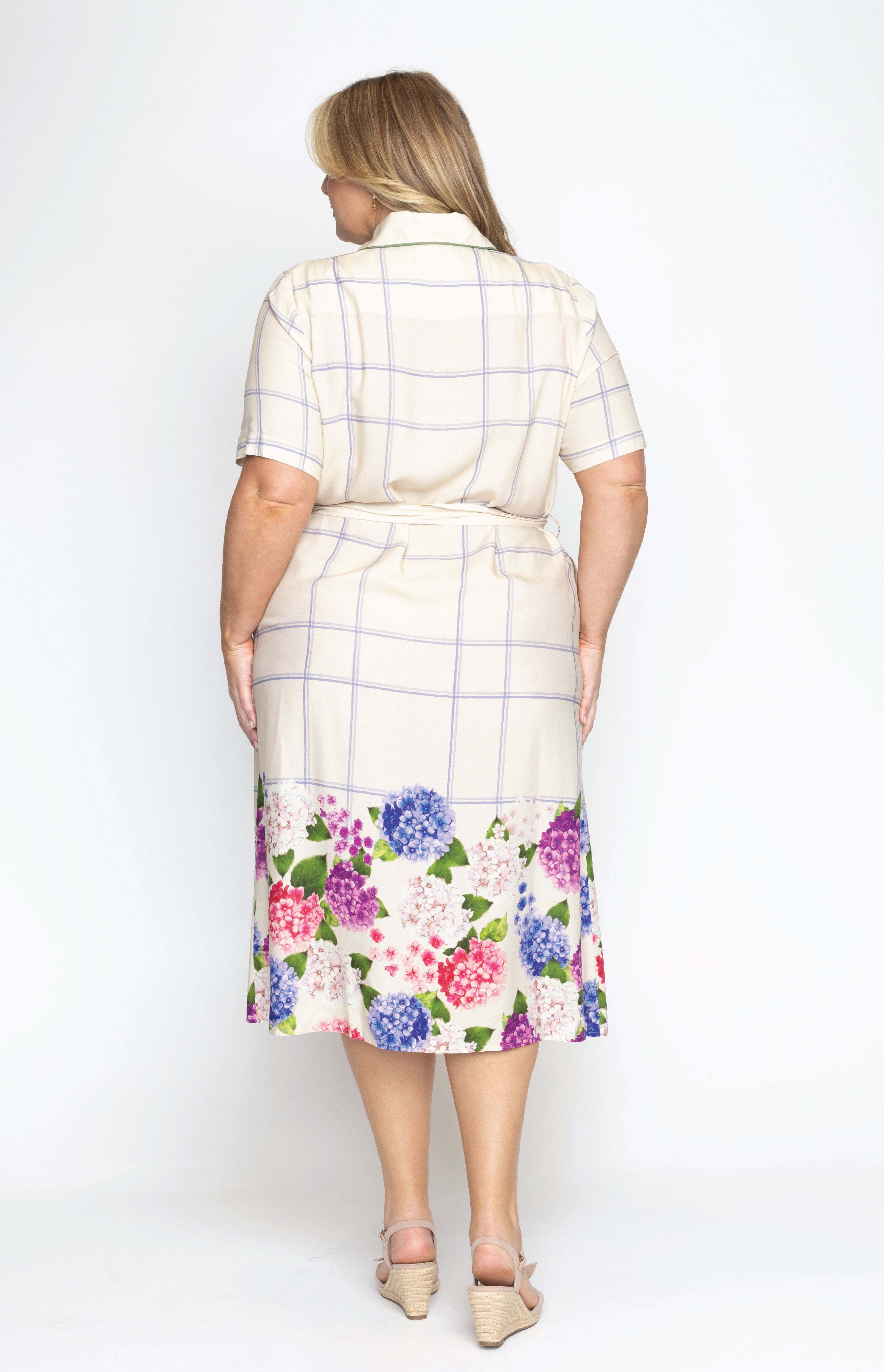 This frock is a fitted traditional shirt dress style, and we have created a contrast hem design featuring our hand-painted florals.