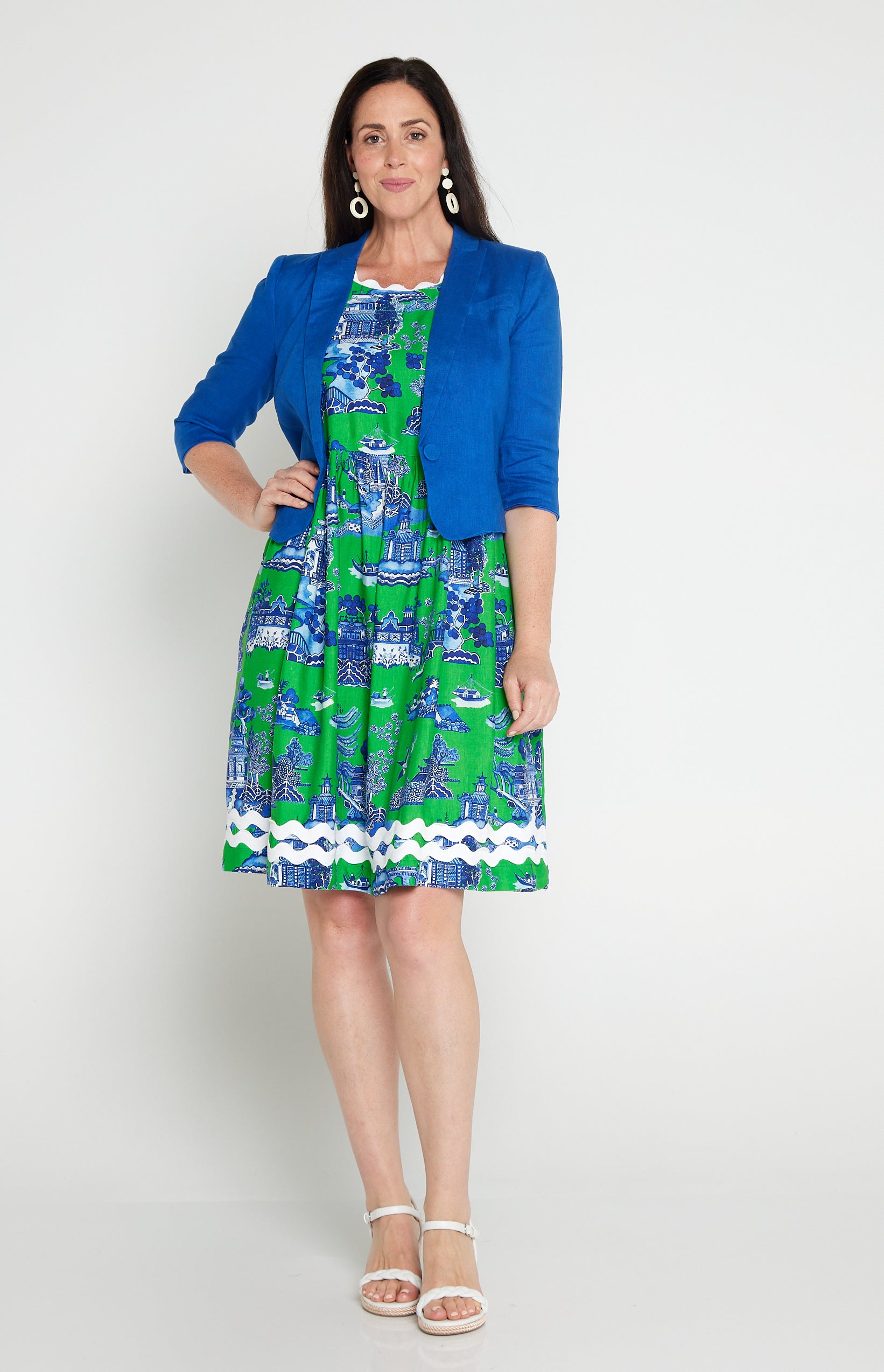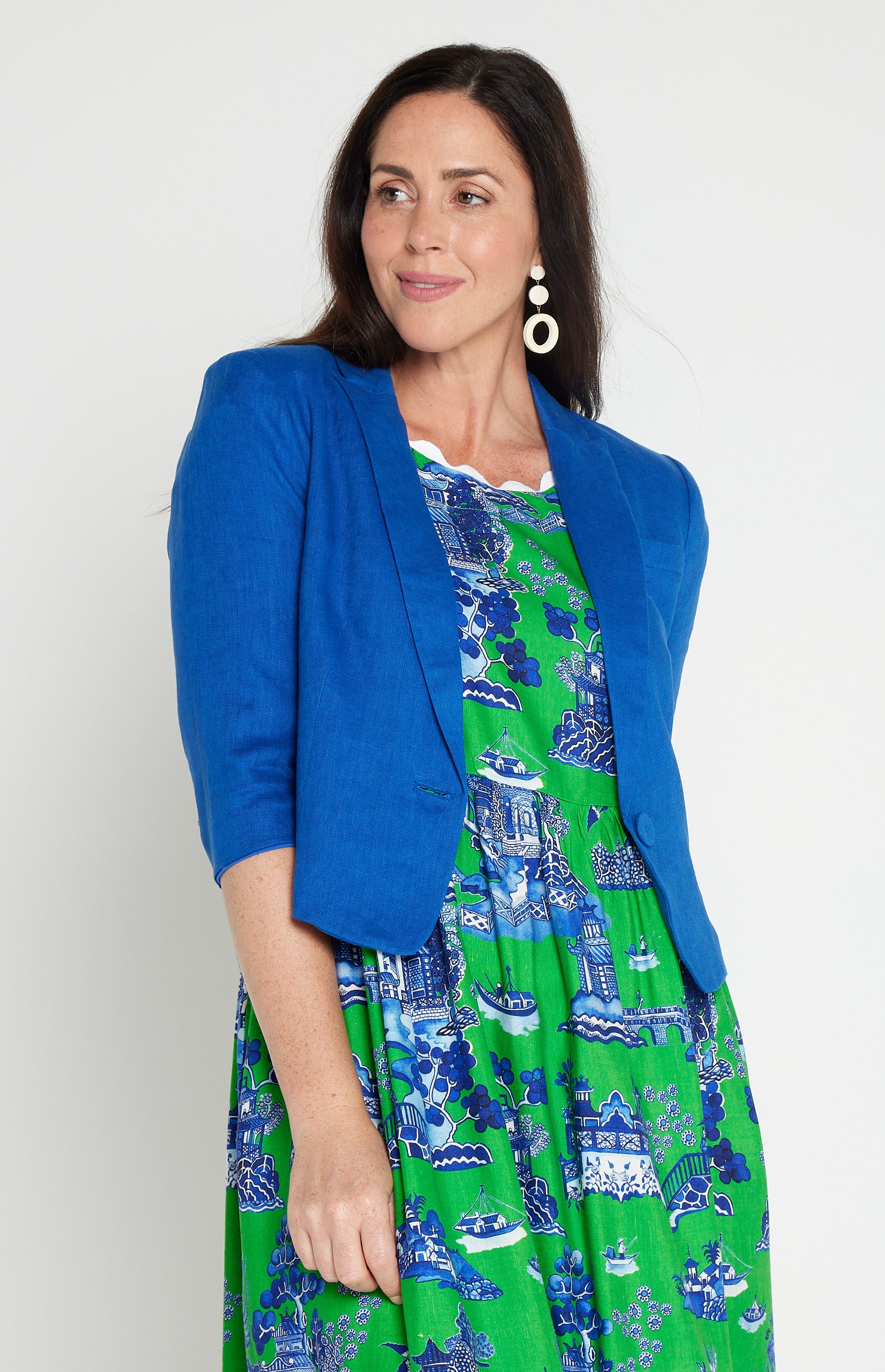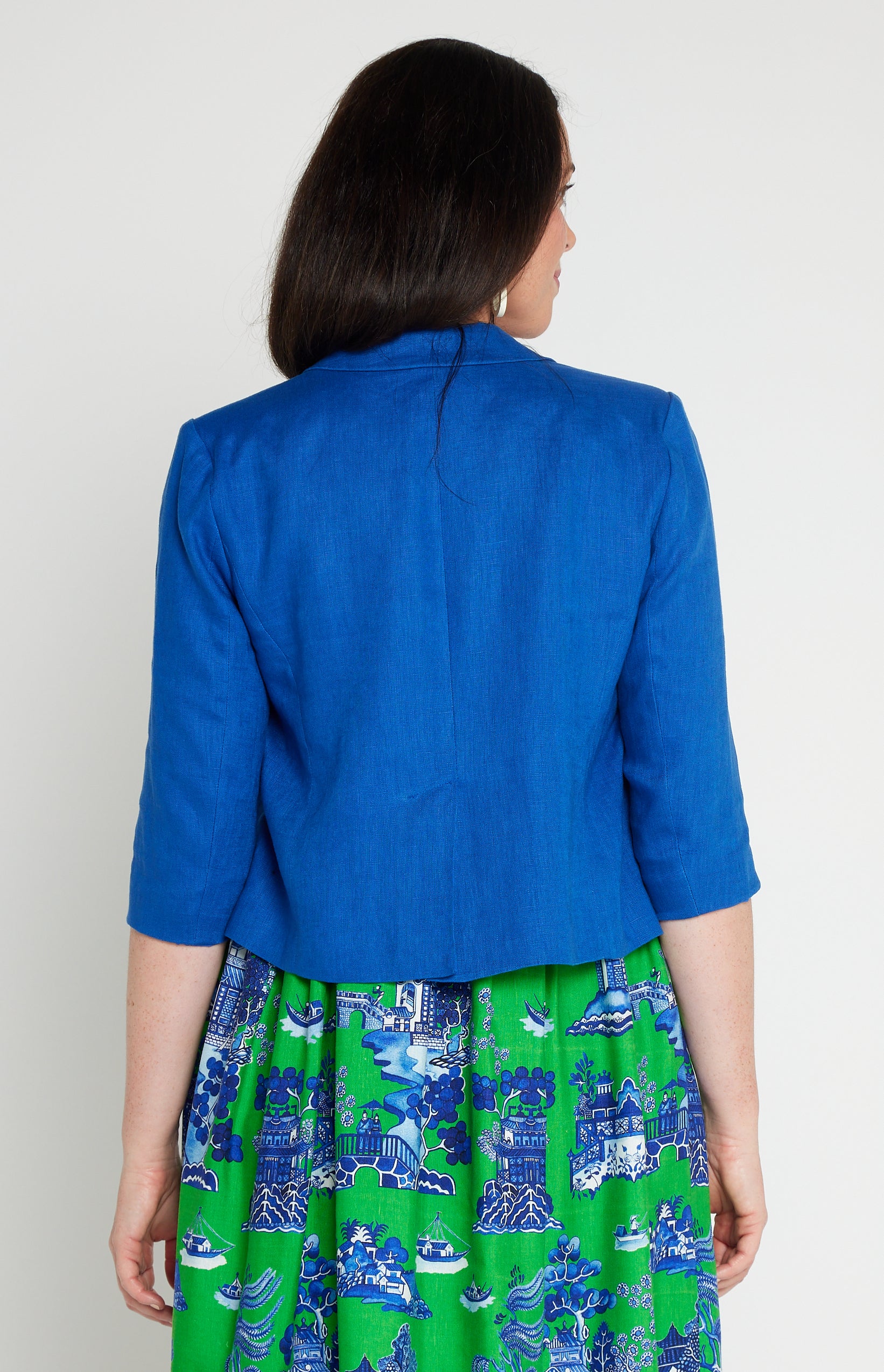 This is based off our Perfect Velvet Blazer except she is made in our luxe linen fabric, and is a cropped length, so she looks perfect over your Maiocchi frocks.