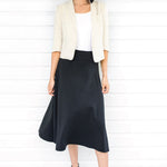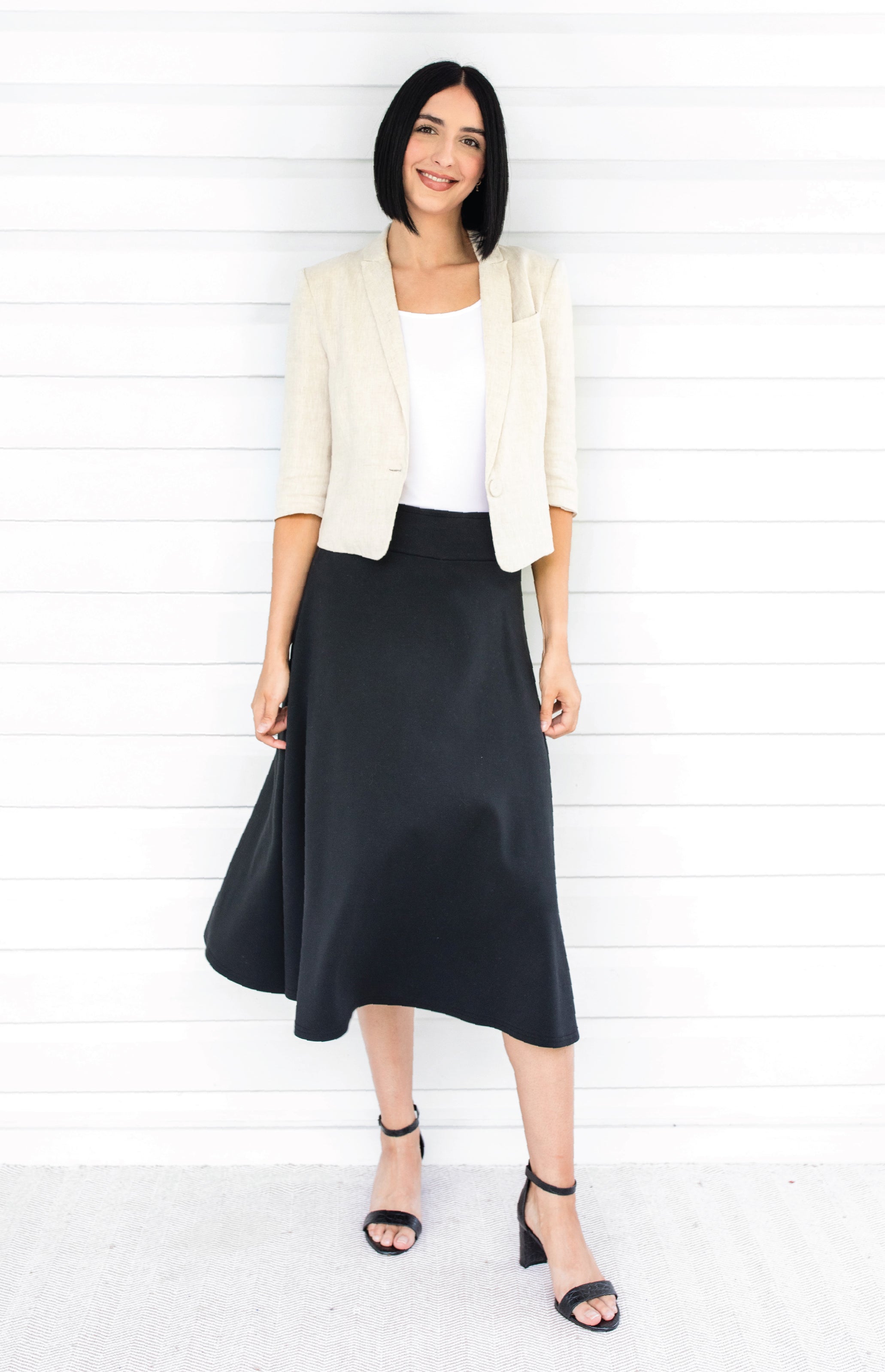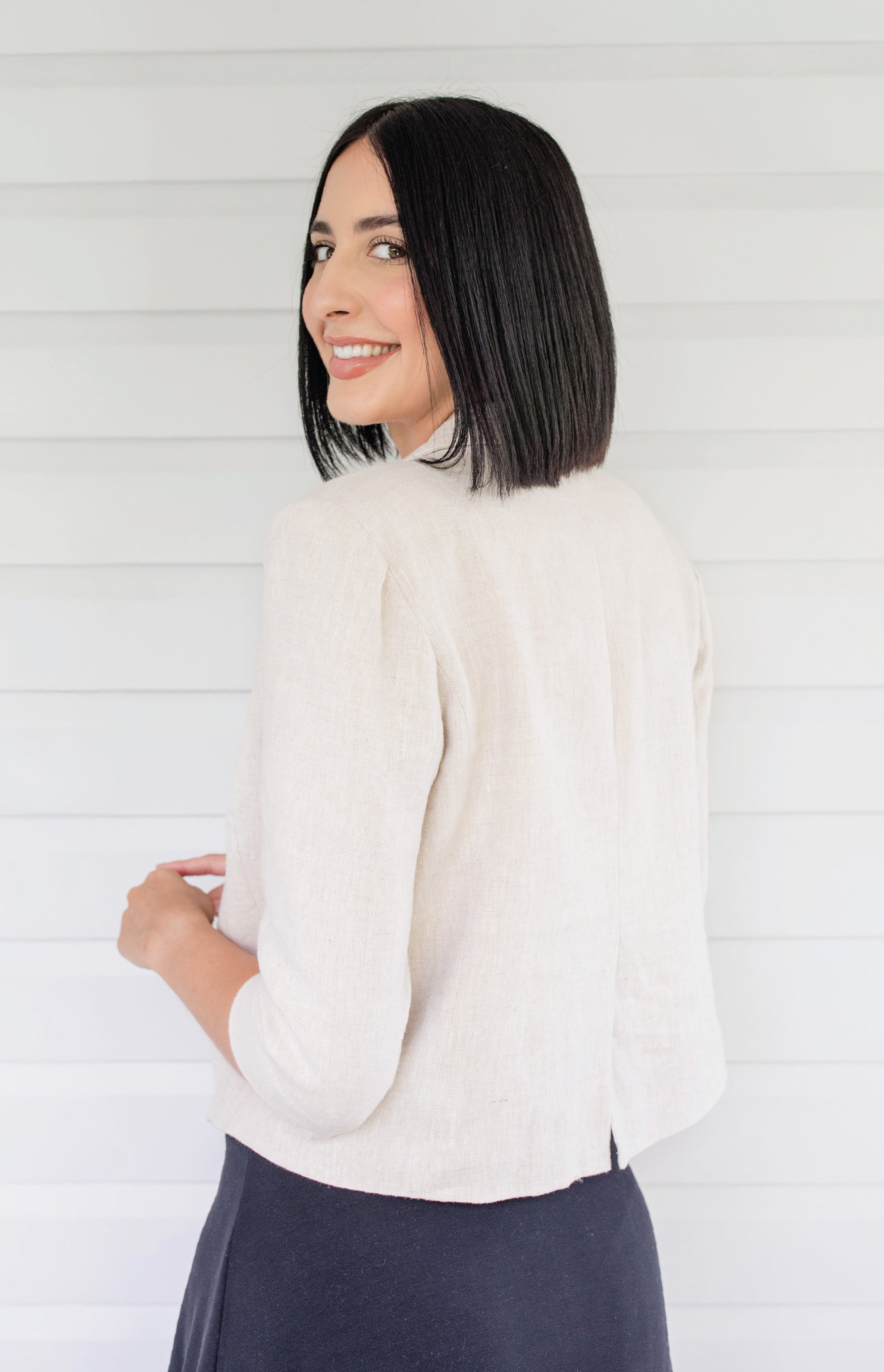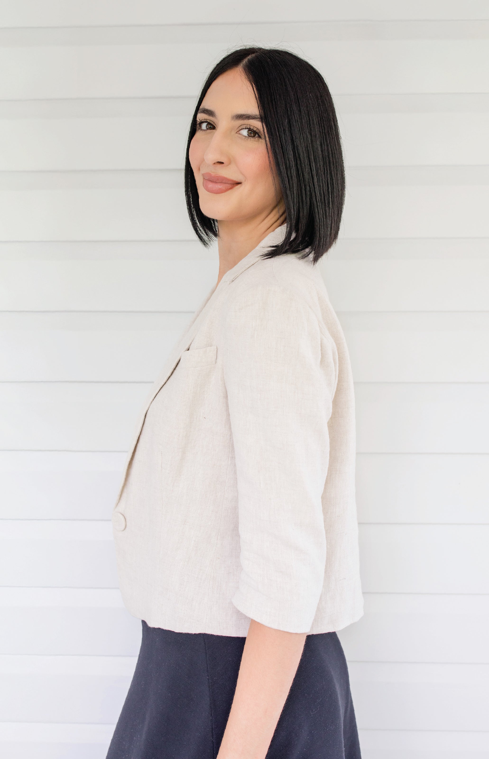 This is based off our Perfect Velvet Blazer except she is made in our luxe linen fabric, and is a cropped length, so she looks perfect over your Maiocchi frocks.