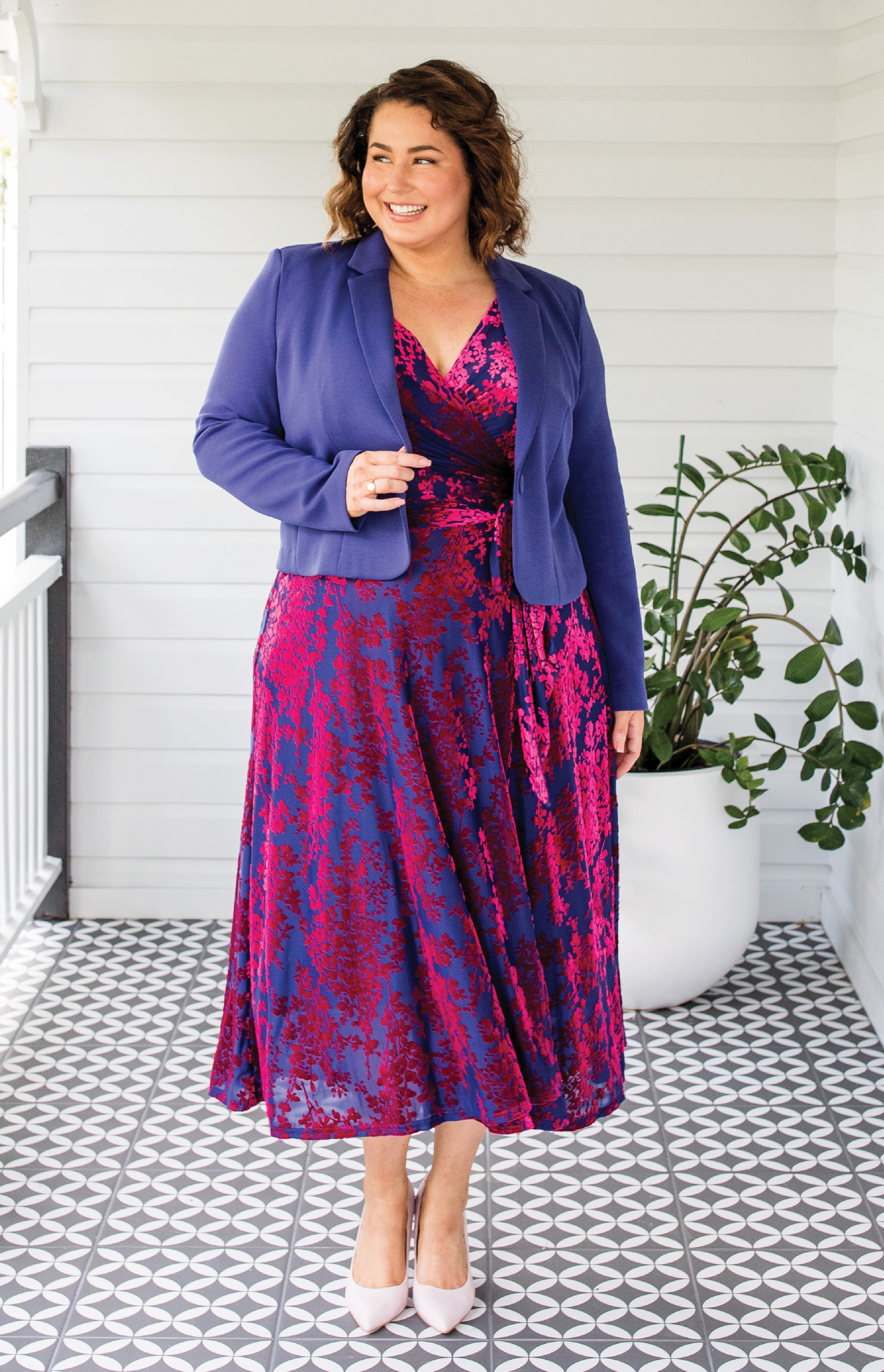 You'll certainly make an entrance in the Violet Dress. A true wrap style dress, with a separate slip dress in a semi sheer opulent velvet burnout fabric. This is the perfect frock to turn heads at your next fancy event.