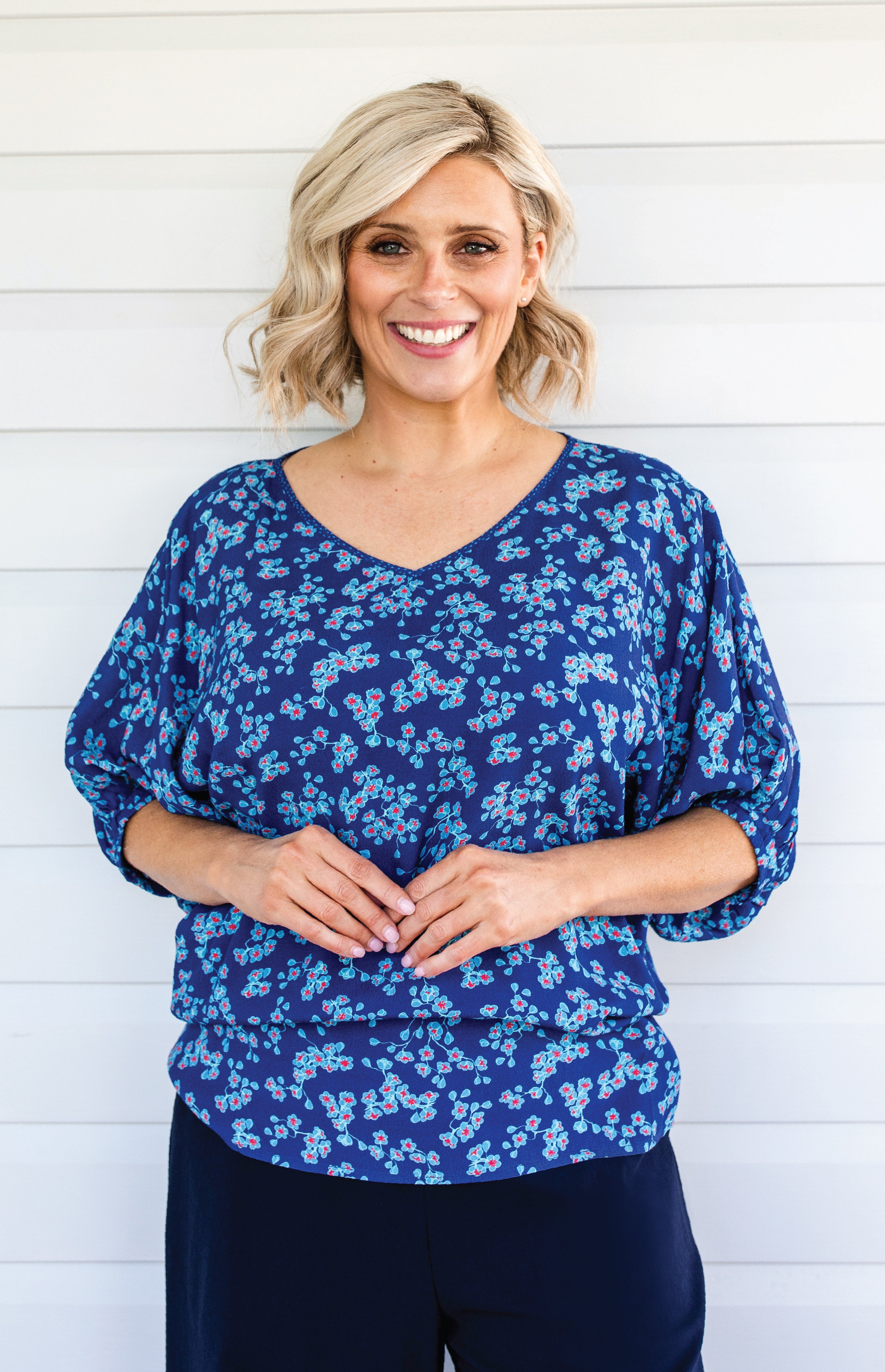 Our Designer Deanne (blonde) is wearing size 8. Her bust is 97cm; Waist 80cm; Hip: 103cm.