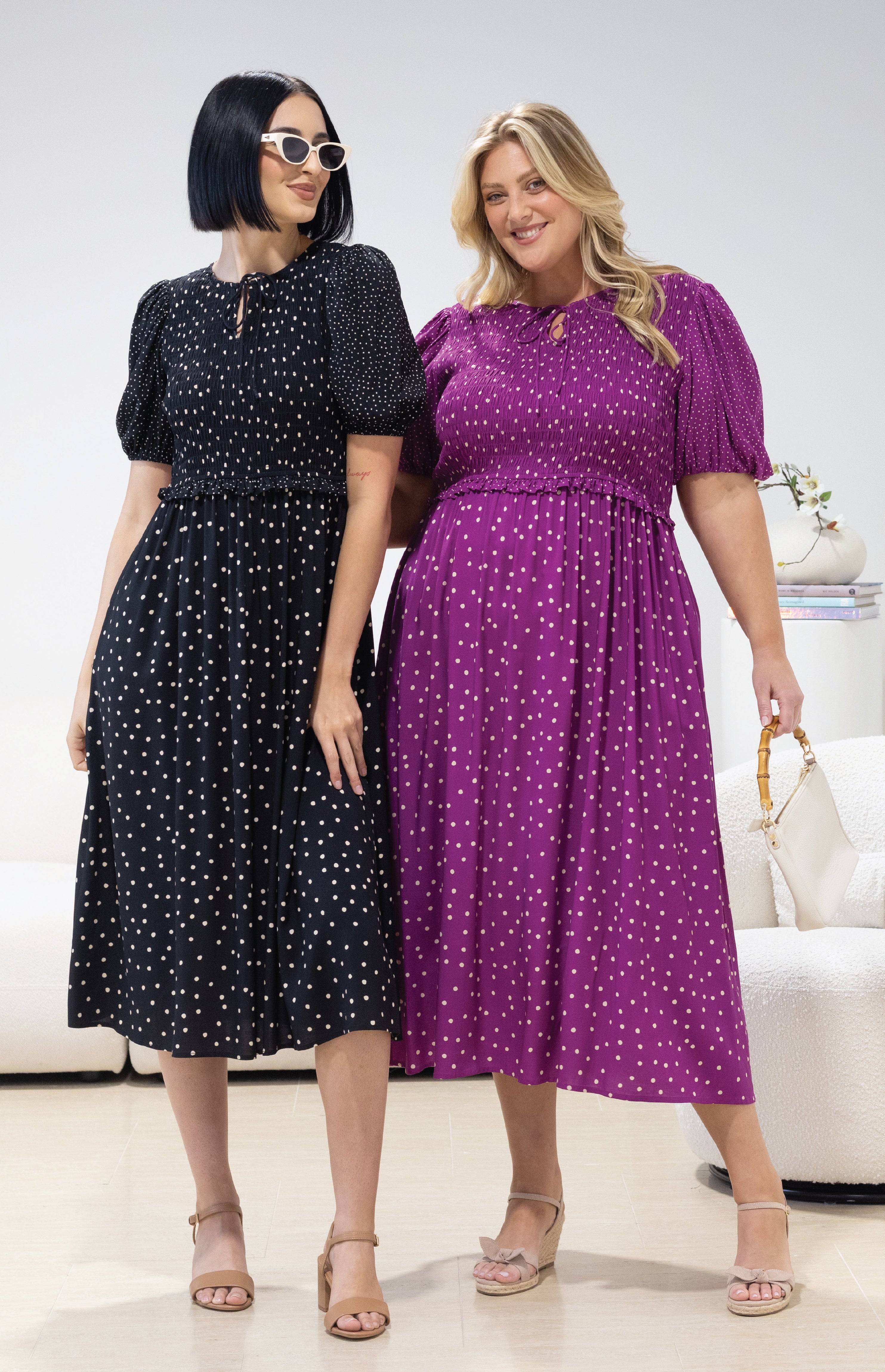 Our Designer Deanne (blonde) is wearing size 8. Her bust is 97cm; Waist 80cm; Hip: 103cm, and she is 162cm tall.