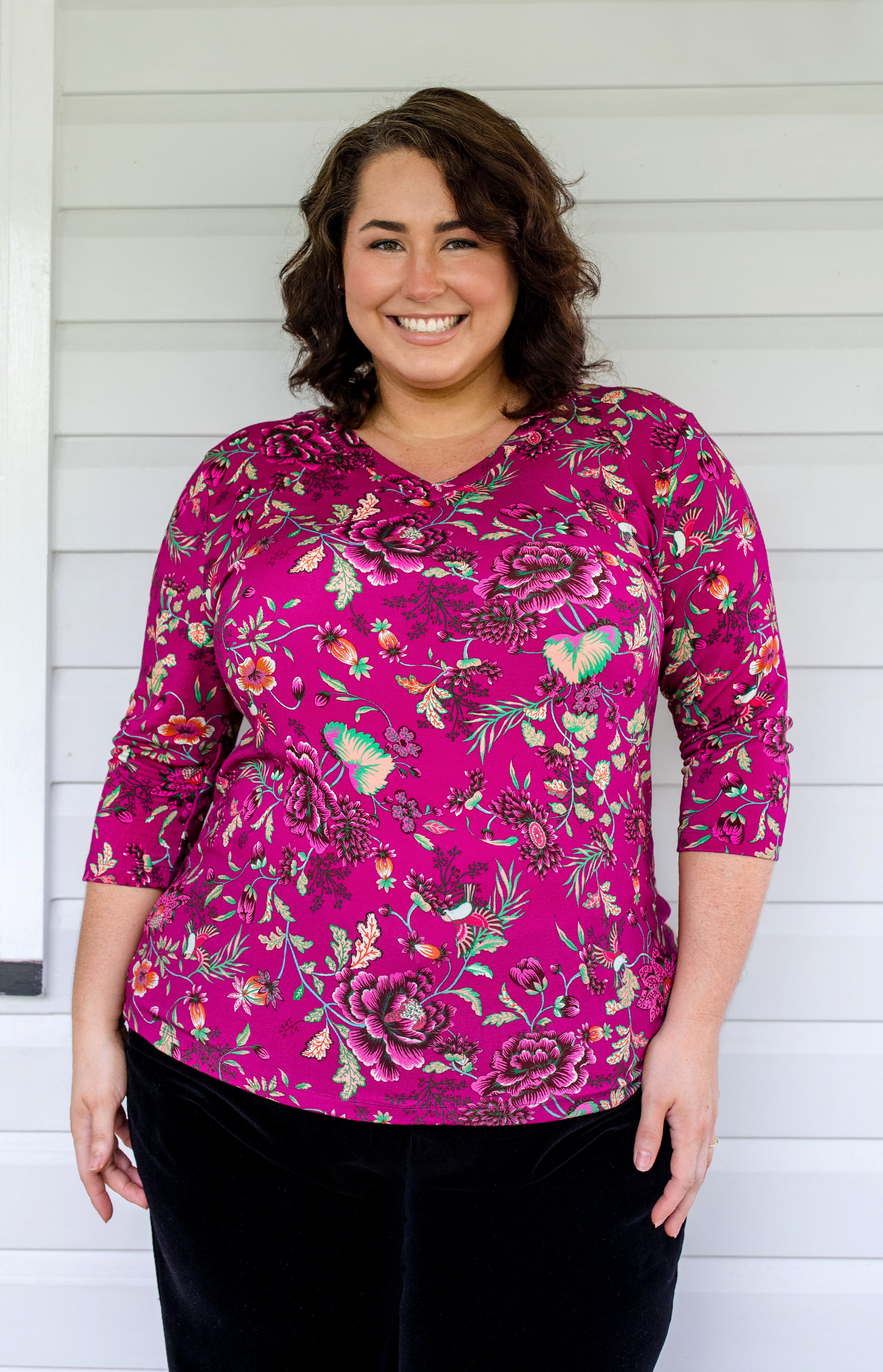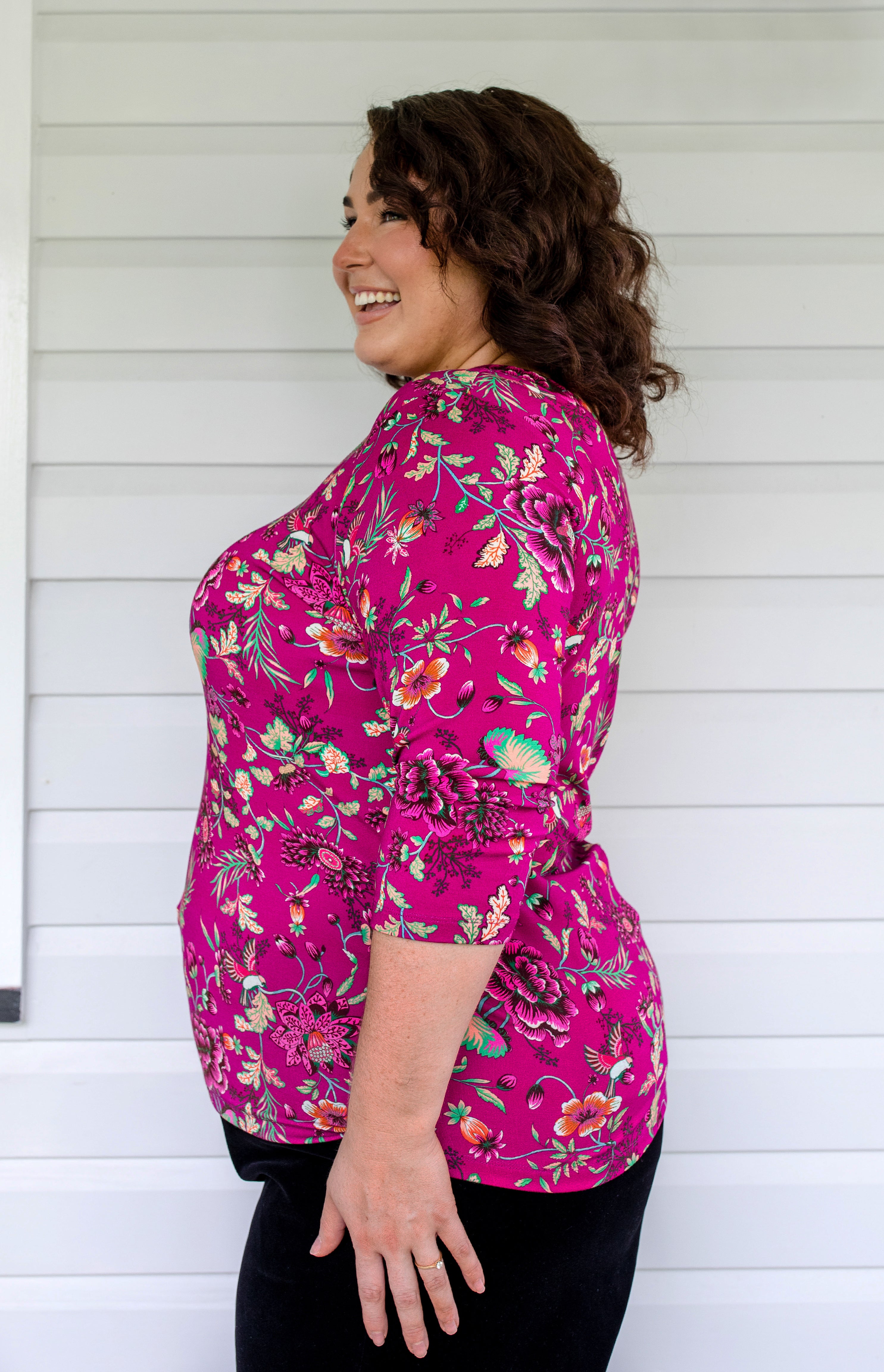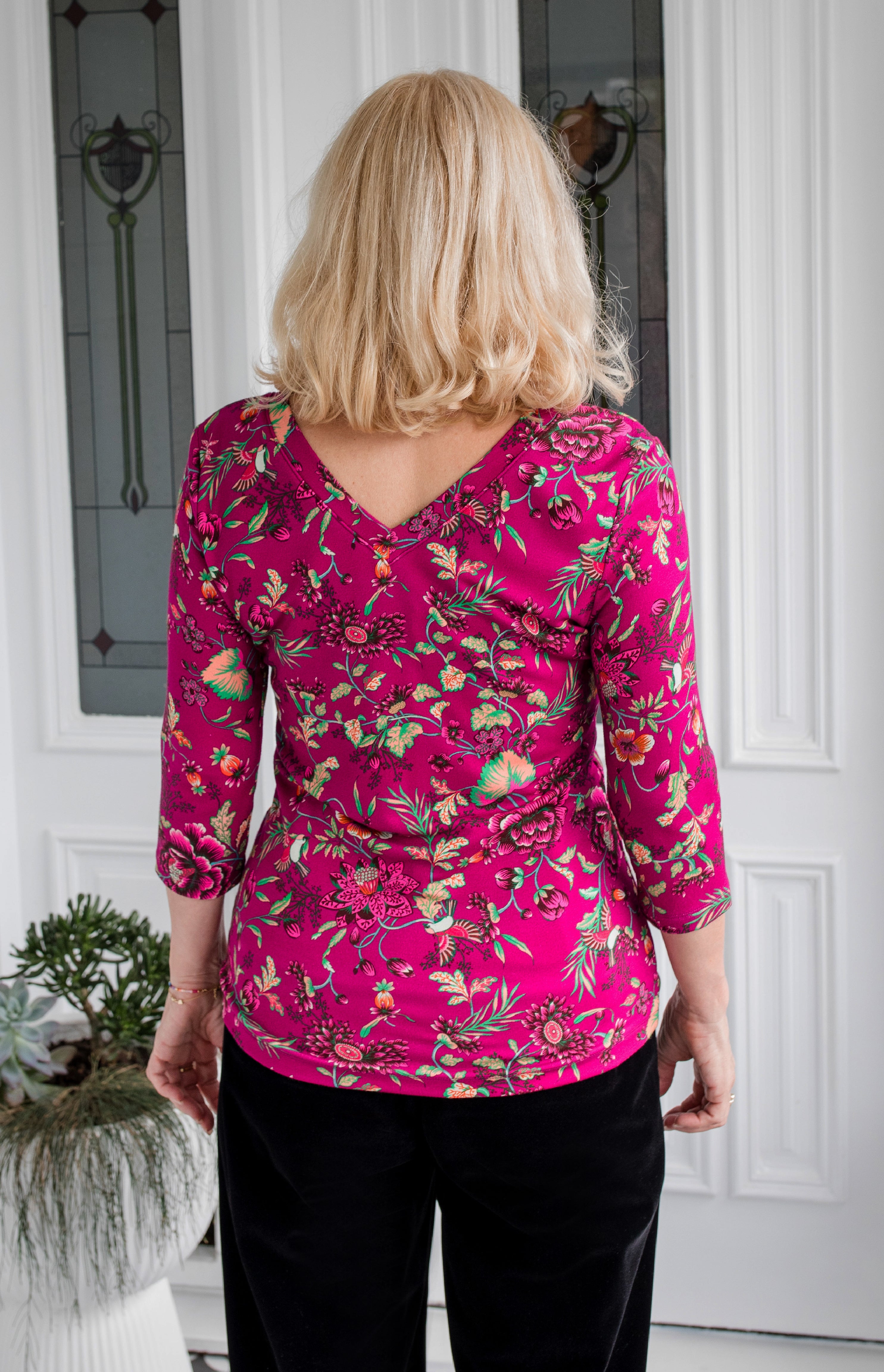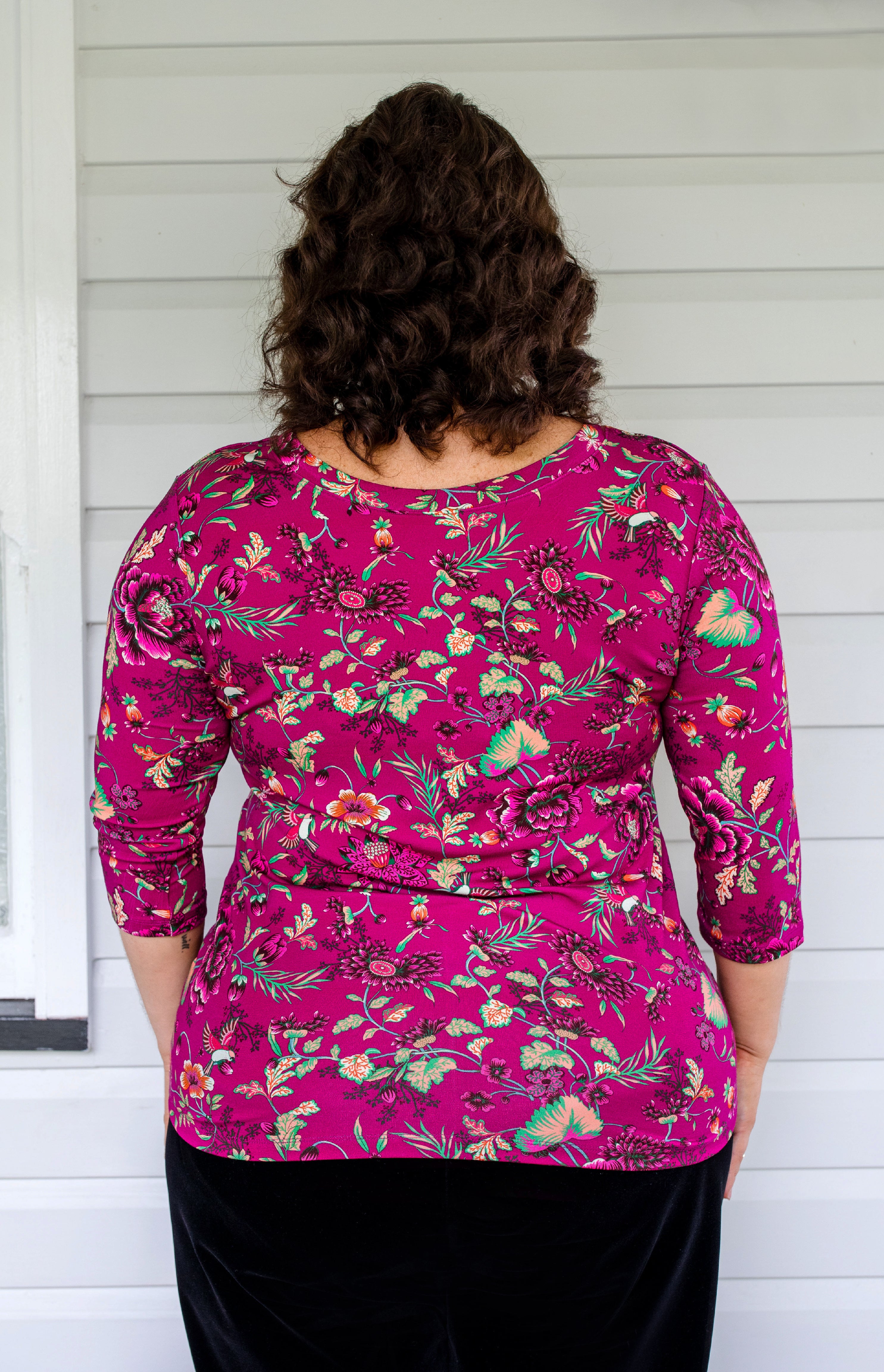 Tallulah Reversible Tee 3/4 sleeve in flights of fancy grape
