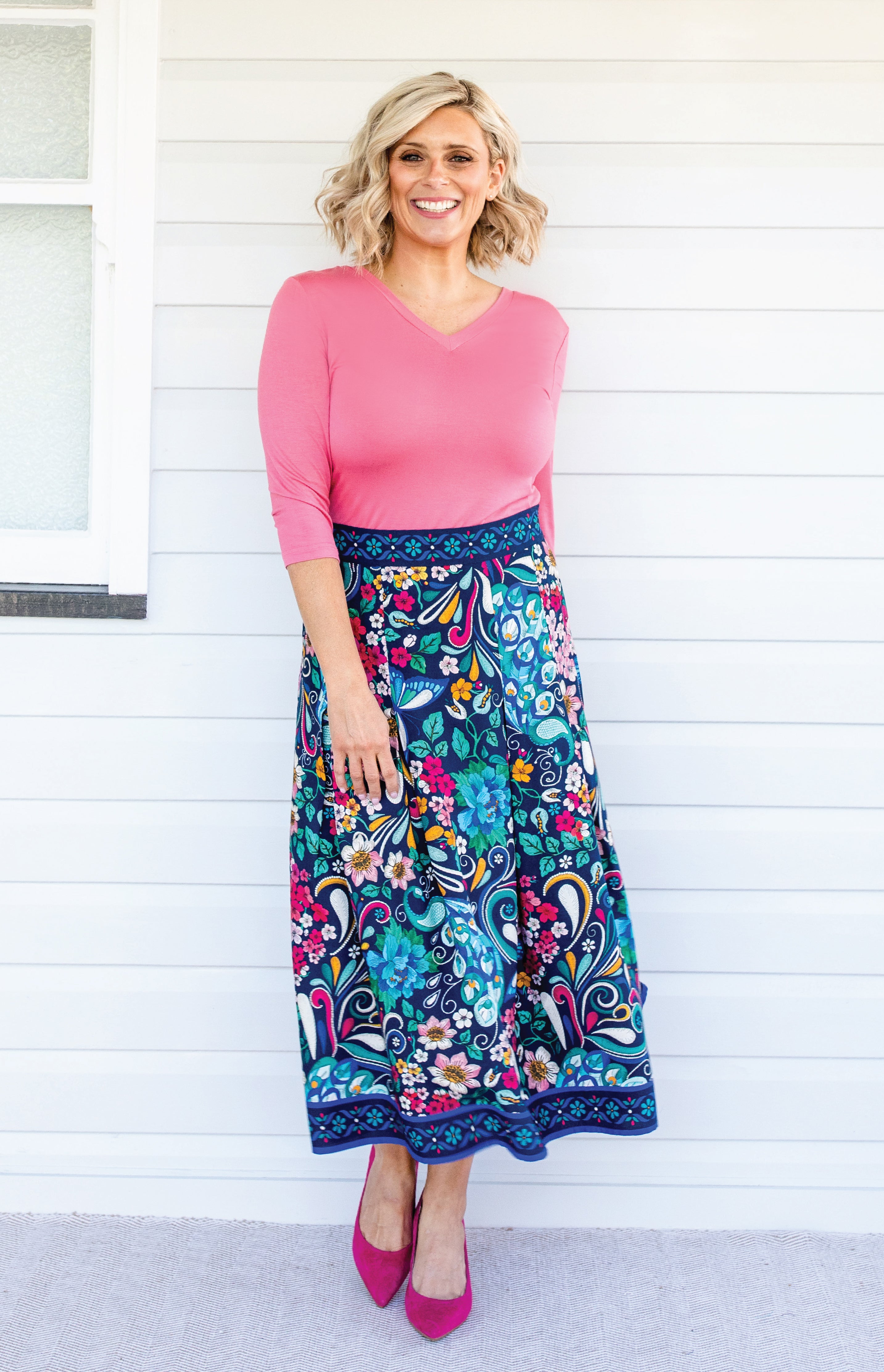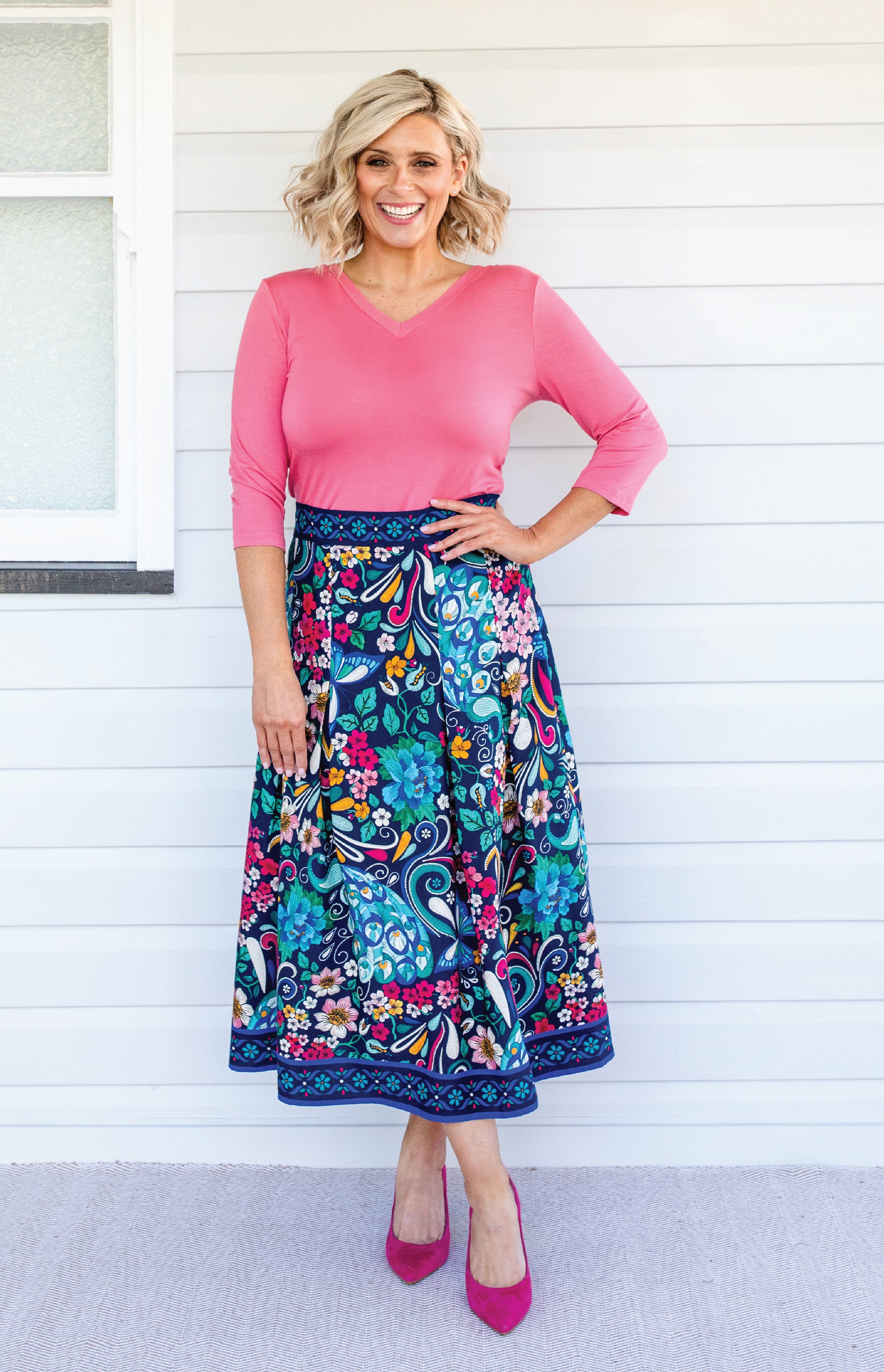 Our Designer Deanne (blonde) is wearing size 8. Her bust is 97cm; Waist 80cm; Hip: 103cm.