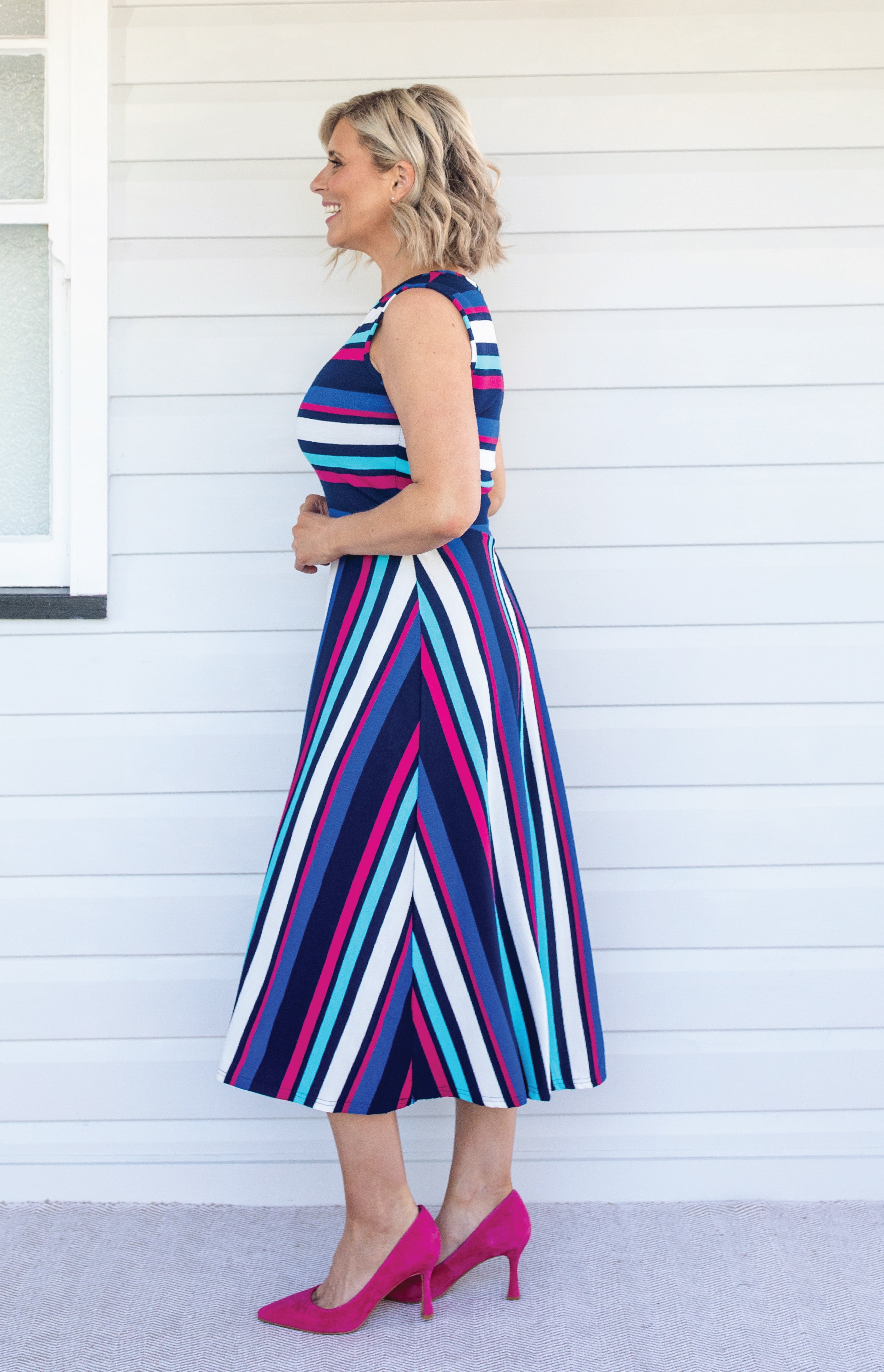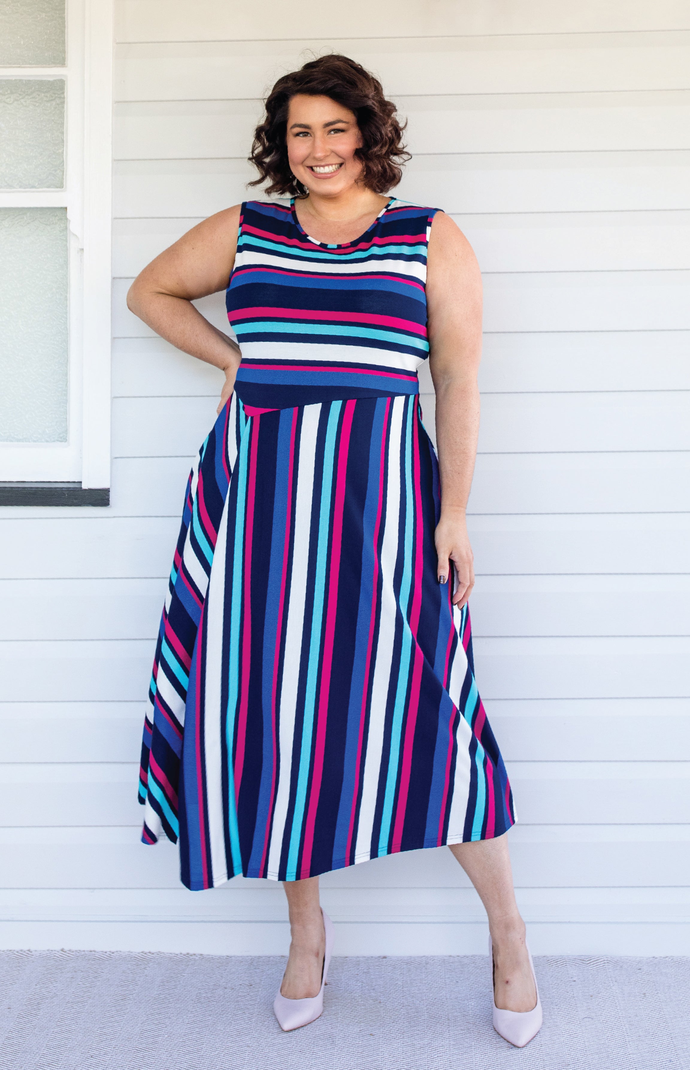 In coloured stripes, with a subtle sparkle texture, see how we have cut the stripes in different directions so that they draw the eye down, elongating the figure. The fullness of the tuck over the tummy and bottom disguise any lumps and bumps.